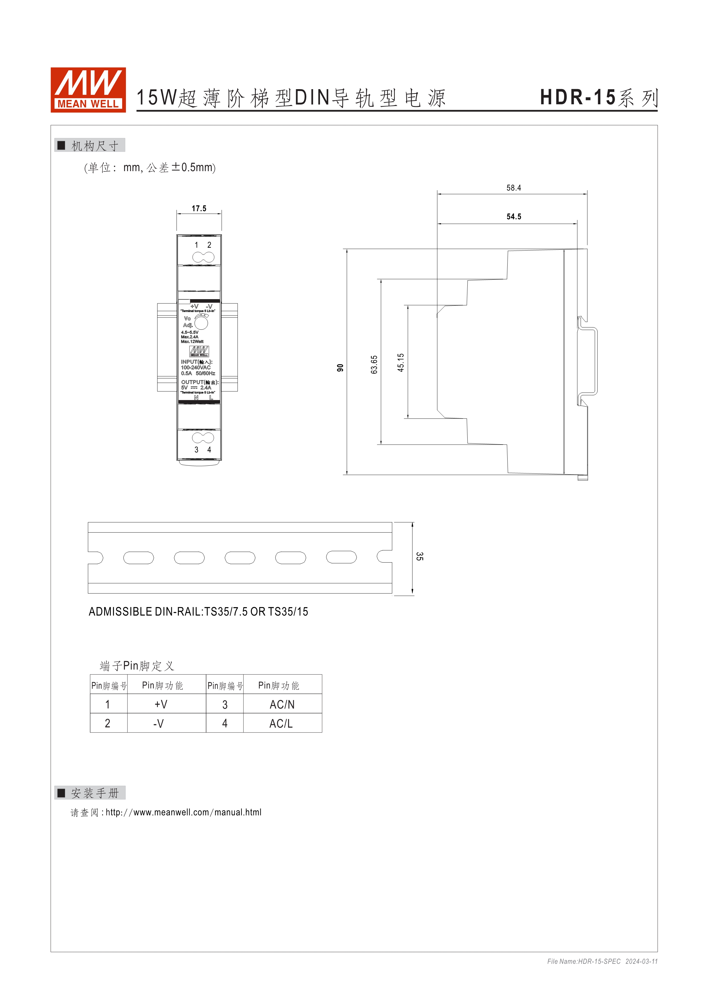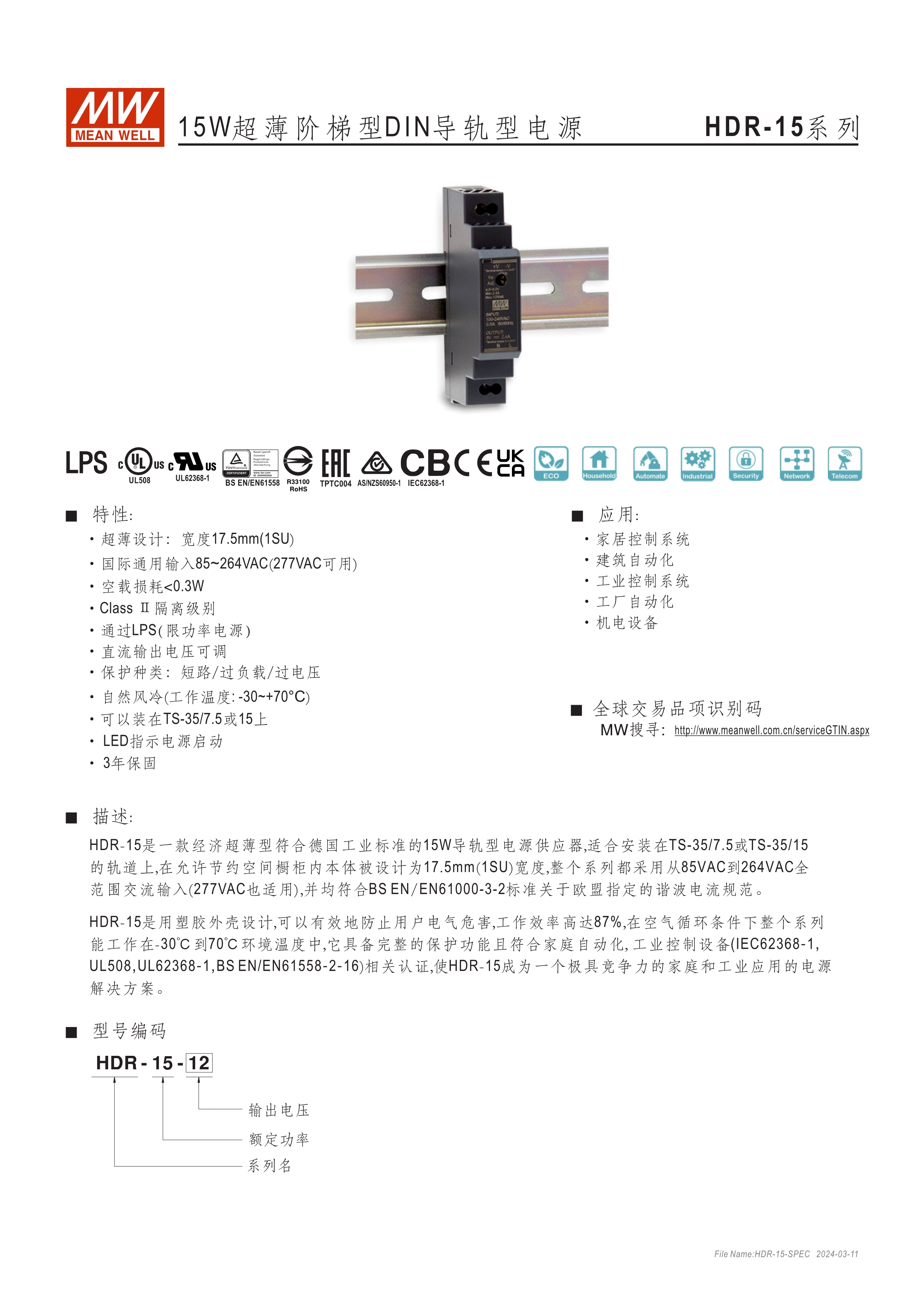階梯形塑料機(jī)殼 單相,全范圍輸入 小尺寸, 1SU~6SU寬 (DIN EN43880) 雙重絕緣等級(jí) 直流輸出電壓可調(diào) 空載待機(jī)消耗瓦數(shù)<0.3W 適合安裝于DIN rail TS-35 / 7.5 或 15 適用于建筑及家電自動(dòng)化控制
