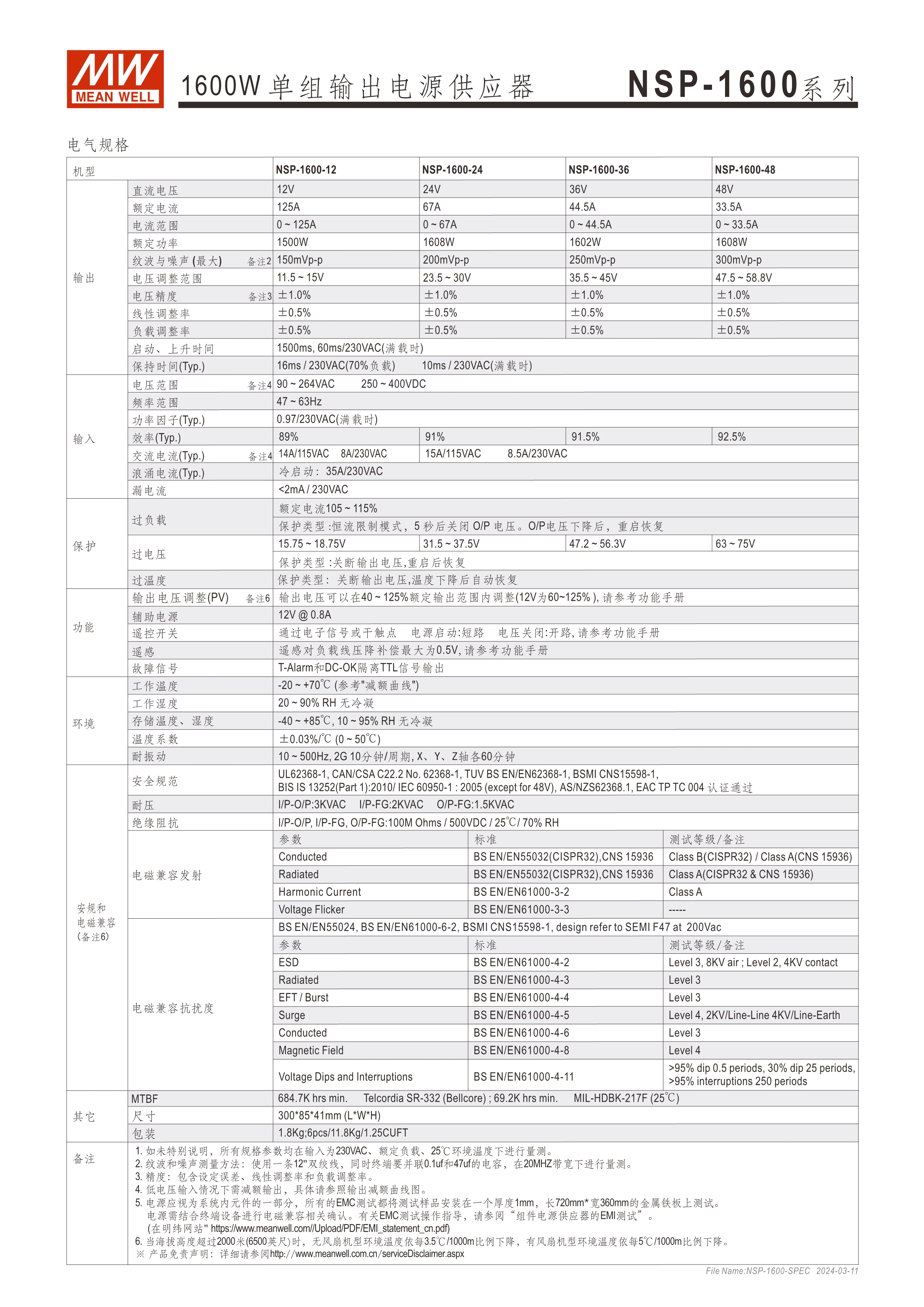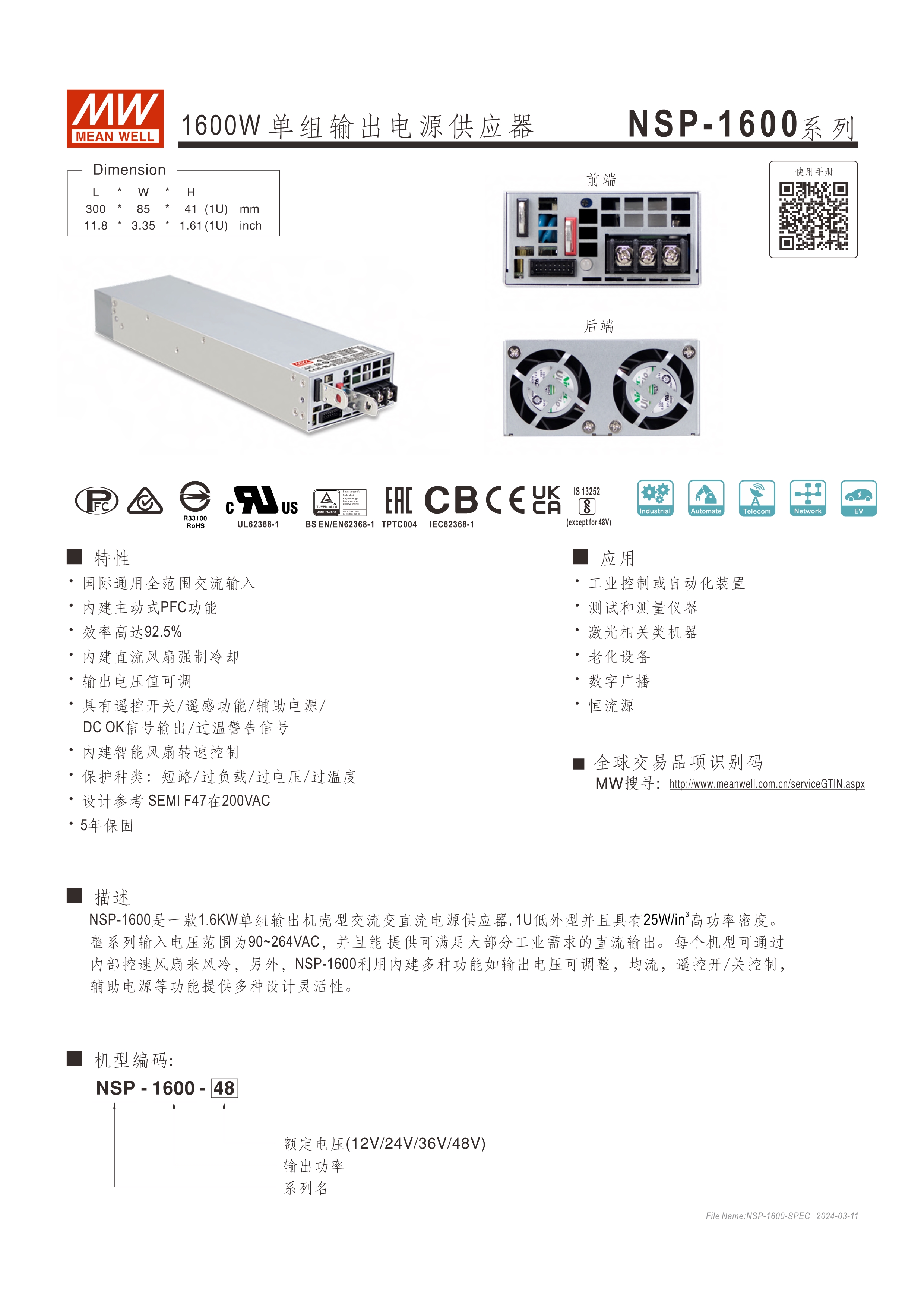 電氣規(guī)格及安規(guī)認(rèn)證皆參照RSP或DPU系列,客戶可直接選用取代,立即導(dǎo)入使用 環(huán)境友善制程與用料 全范圍電壓輸入 效率最高可達(dá)94.5% 內(nèi)建PV功能 設(shè)計(jì)符合SEMI F47 @200Vac