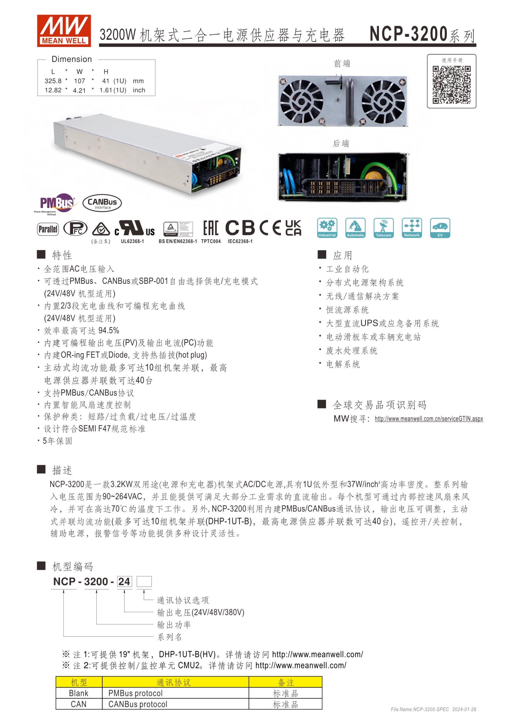 系統(tǒng)電源解決方案 (PDF) PMBus、CANBus可選擇供電或充電模式或SBP-001(僅適用于24V/48V型號) 內置2/3段充電曲線和可編程曲線(僅適用于2V/48V型號) 效率高達94.5% 具有OR-ingFET余能,支持熱插(hotplug) 主動式并聯(lián)均流多達10個機架(DHP-1UT-B)和可并聯(lián)之最大電源為40臺 具有1C接口,支持PMBus/CANBus協(xié)議
