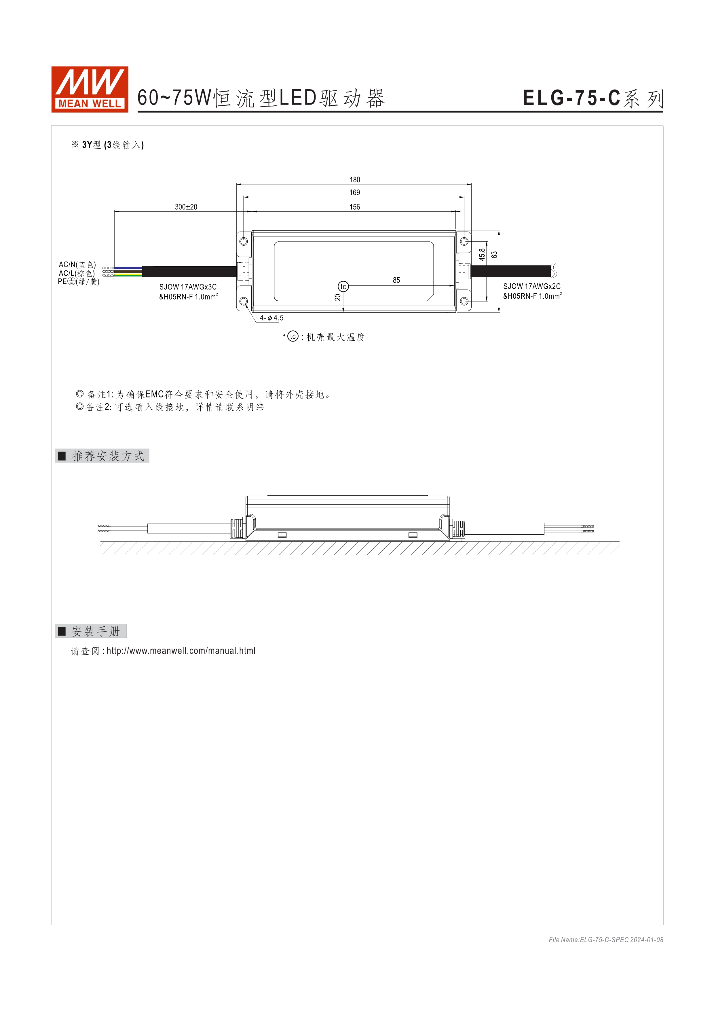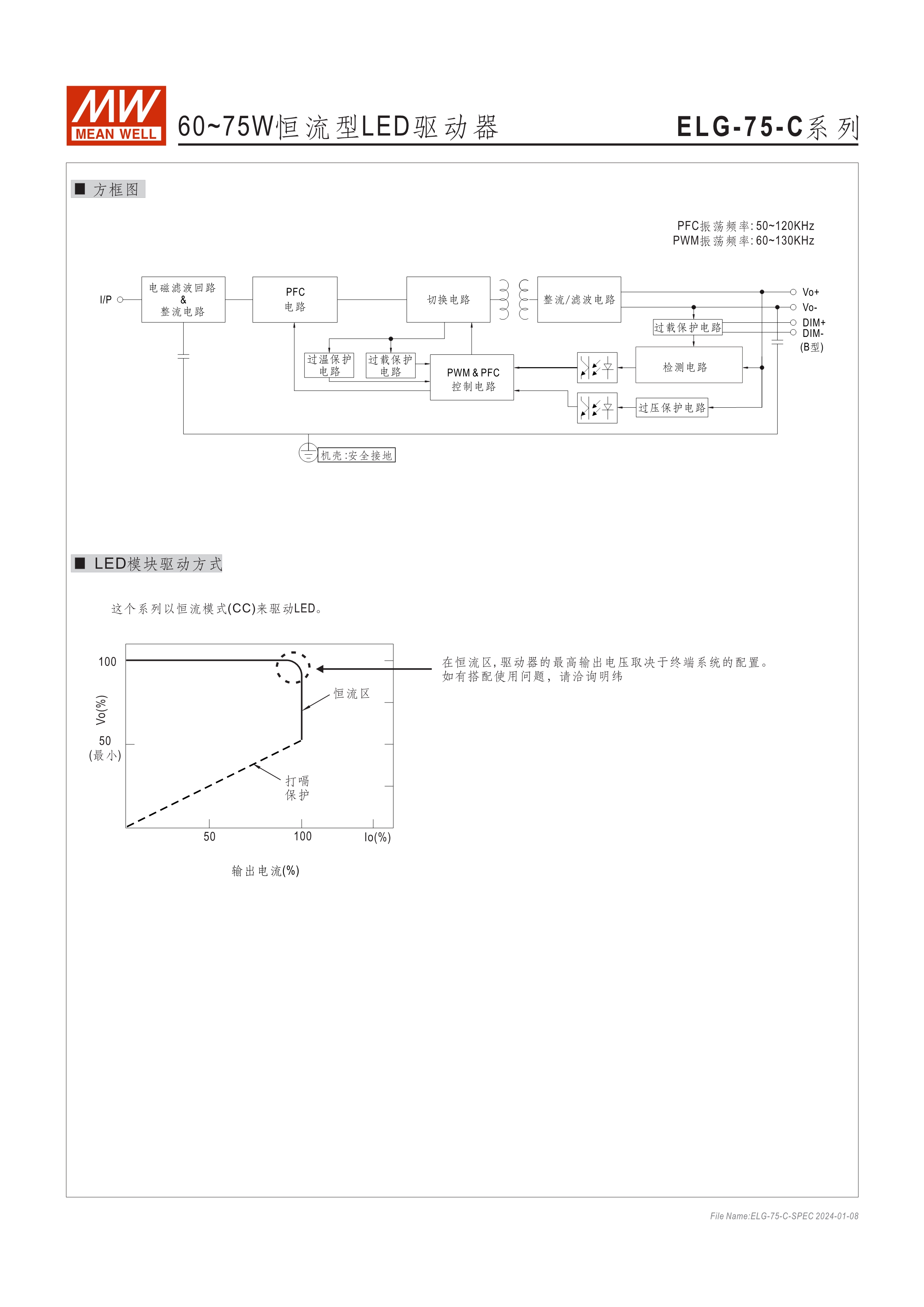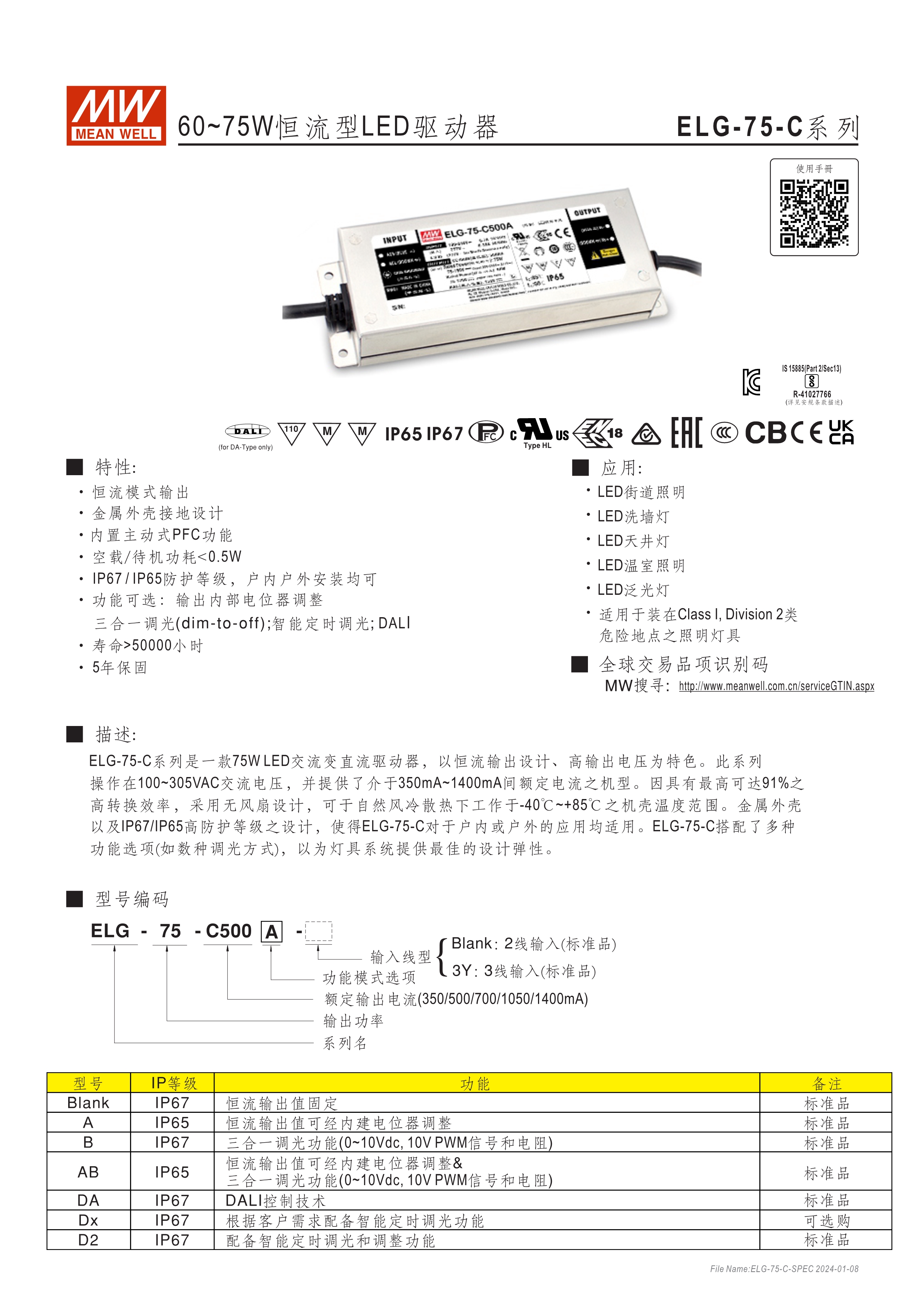 輸入范圍100~305VAC 恒流輸出機(jī)種 恒功率輸出機(jī)種(ELGC-300) 內(nèi)置主動(dòng)式PFC功能 空載/待機(jī)消耗<0.5W 金屬外殼,IP67/IP65防護(hù)等級(jí)可用于戶外與室內(nèi) 功能選項(xiàng) : 輸出可經(jīng)由電位器調(diào)整;三合一調(diào)光(0~10Vdc或10V PWM信號(hào)或電阻,可關(guān)斷);智能定時(shí)調(diào)光;DALI;輔助直流輸出(ELG-150-C BE-Type) Type "HL" LED電源適用在安裝于Class I, Division 2 類 危險(xiǎn)地點(diǎn)之照明燈具 適合于LED路燈及戶外LED照明等應(yīng)用 5年保固期