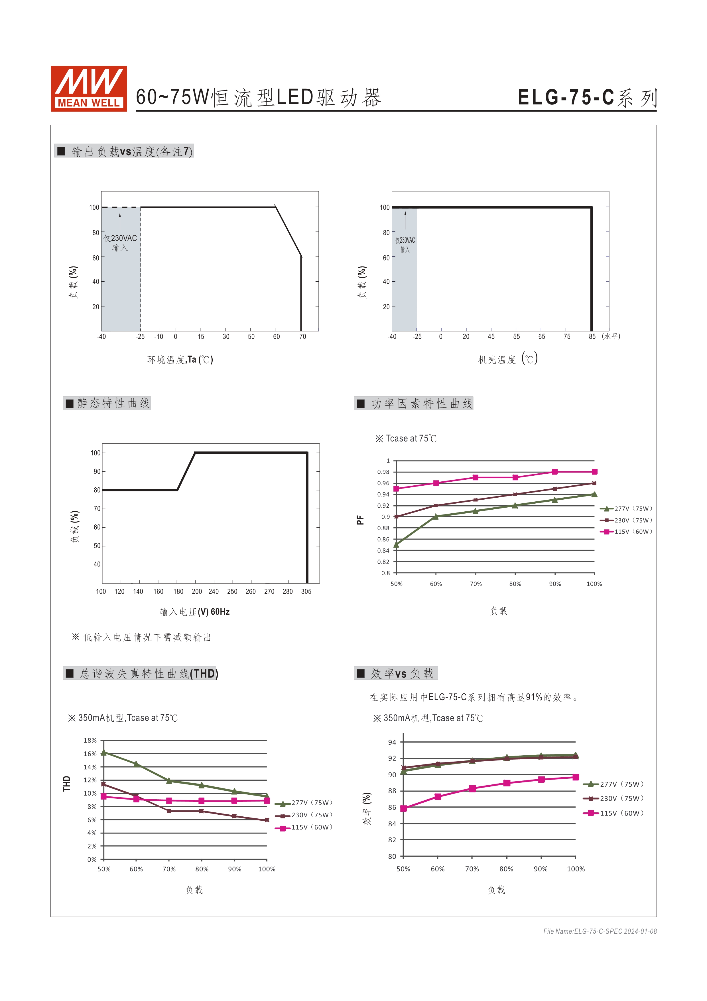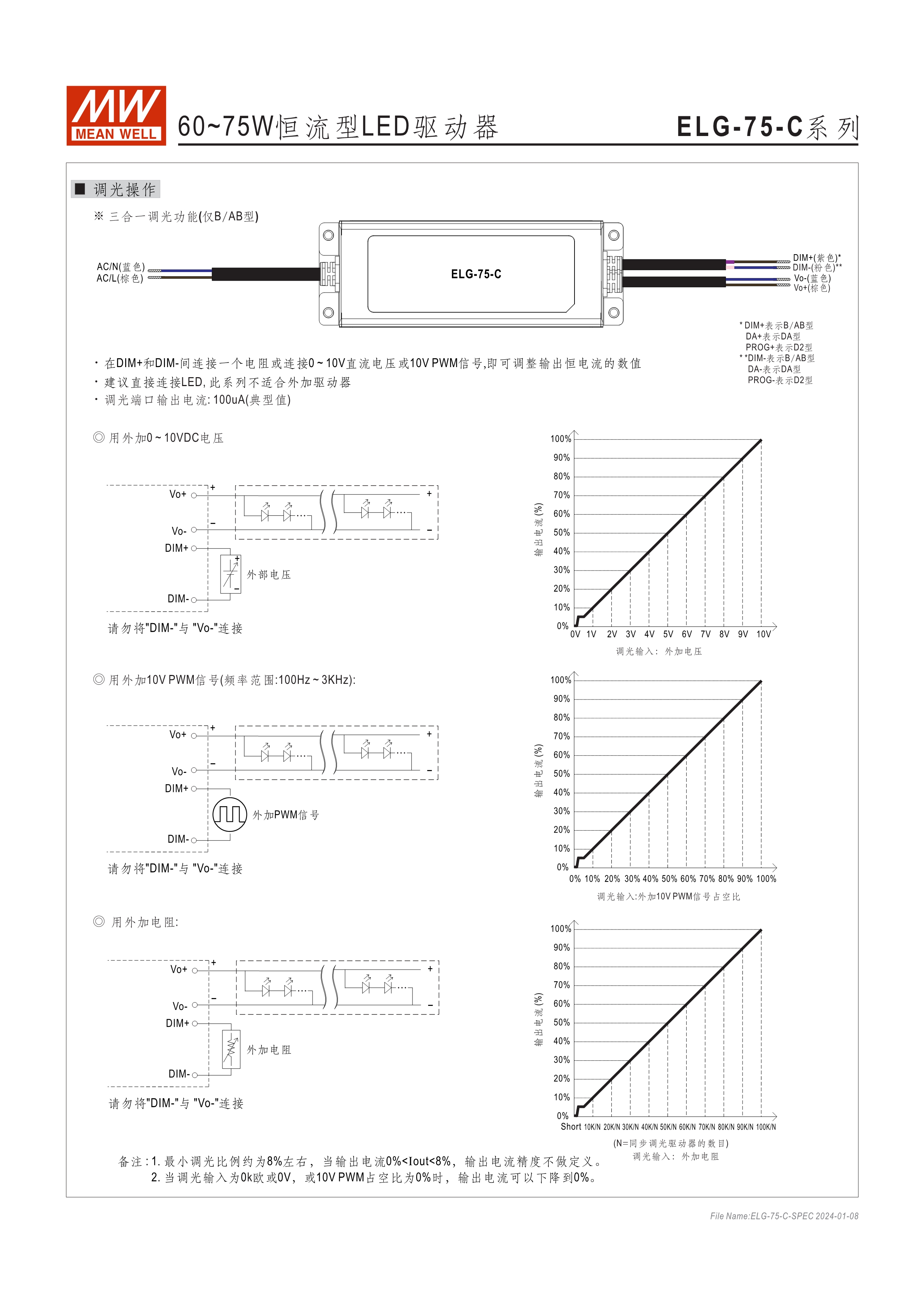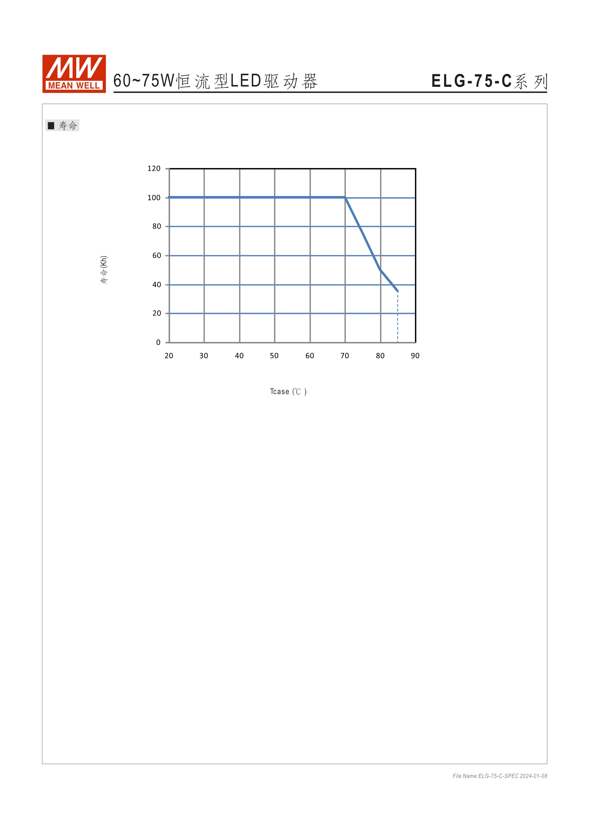 輸入范圍100~305VAC 恒流輸出機(jī)種 恒功率輸出機(jī)種(ELGC-300) 內(nèi)置主動(dòng)式PFC功能 空載/待機(jī)消耗<0.5W 金屬外殼,IP67/IP65防護(hù)等級(jí)可用于戶外與室內(nèi) 功能選項(xiàng) : 輸出可經(jīng)由電位器調(diào)整;三合一調(diào)光(0~10Vdc或10V PWM信號(hào)或電阻,可關(guān)斷);智能定時(shí)調(diào)光;DALI;輔助直流輸出(ELG-150-C BE-Type) Type "HL" LED電源適用在安裝于Class I, Division 2 類 危險(xiǎn)地點(diǎn)之照明燈具 適合于LED路燈及戶外LED照明等應(yīng)用 5年保固期