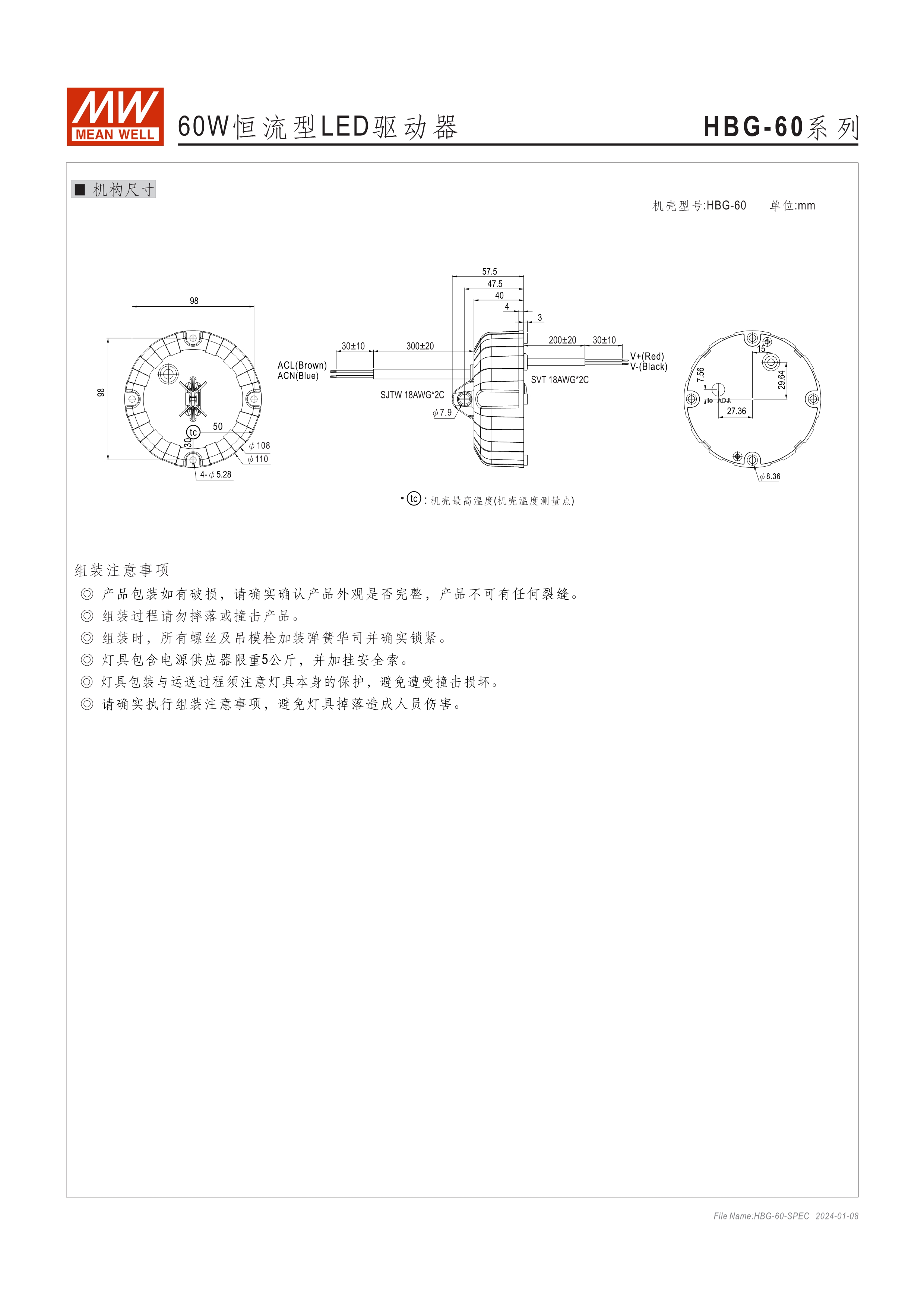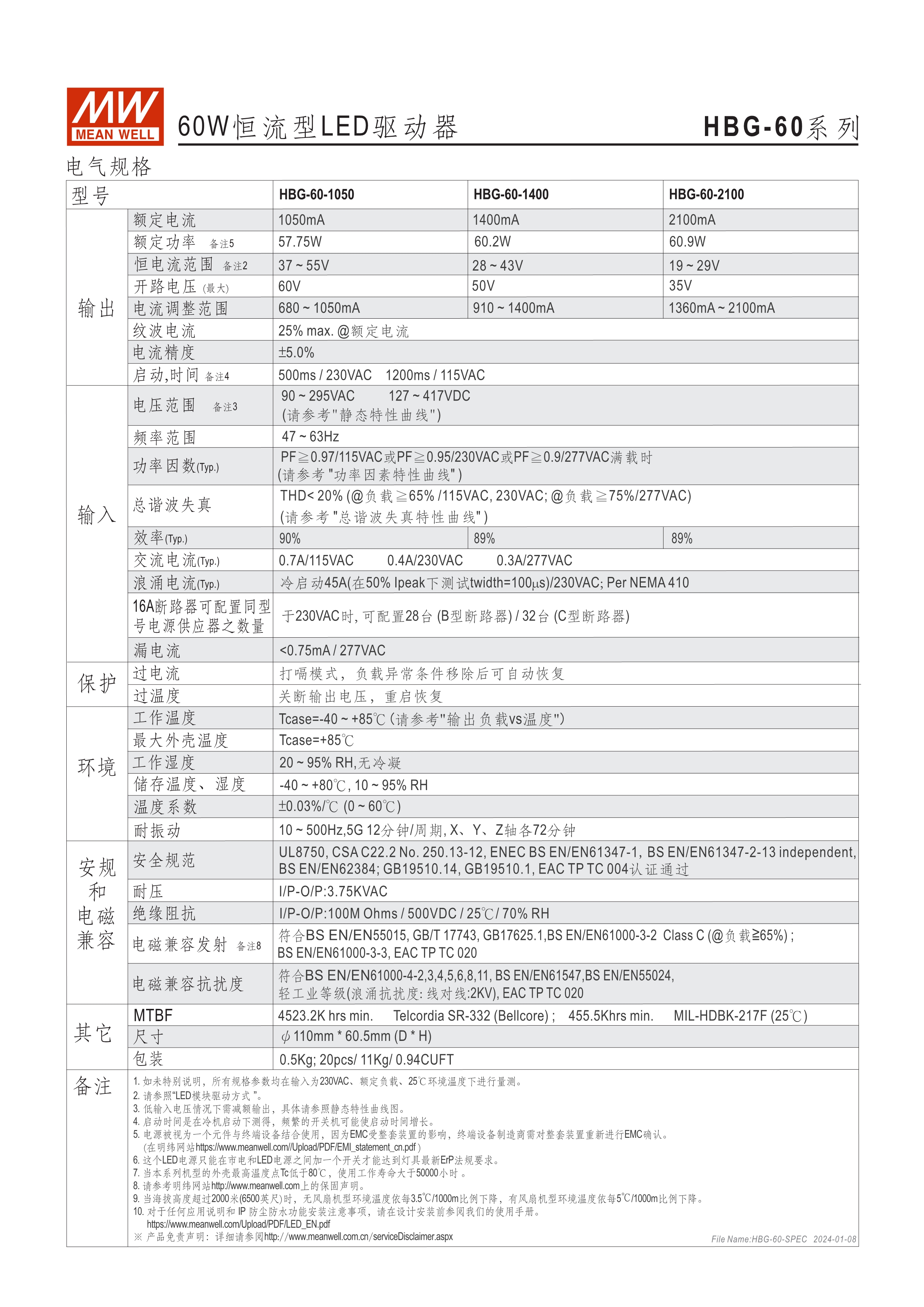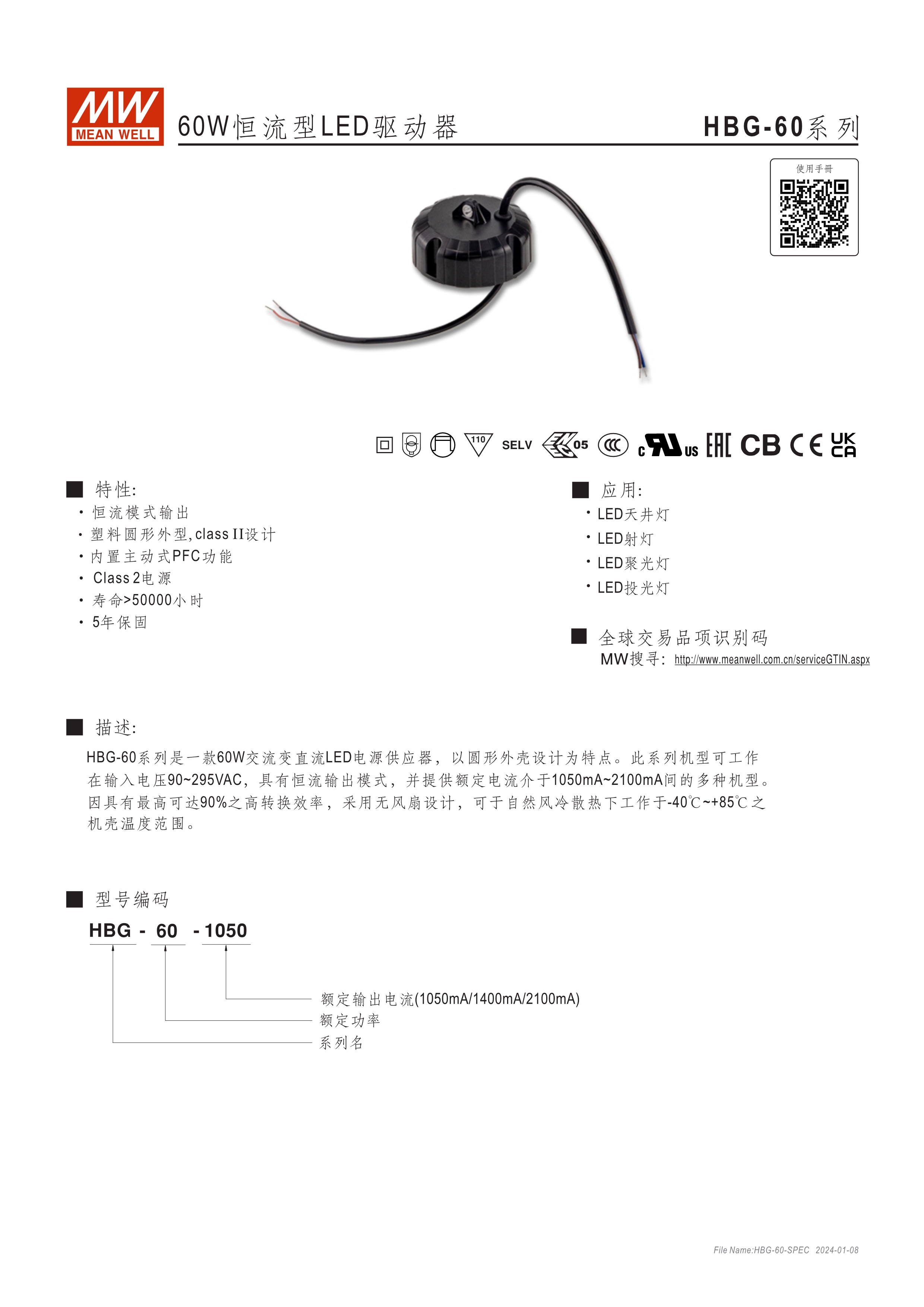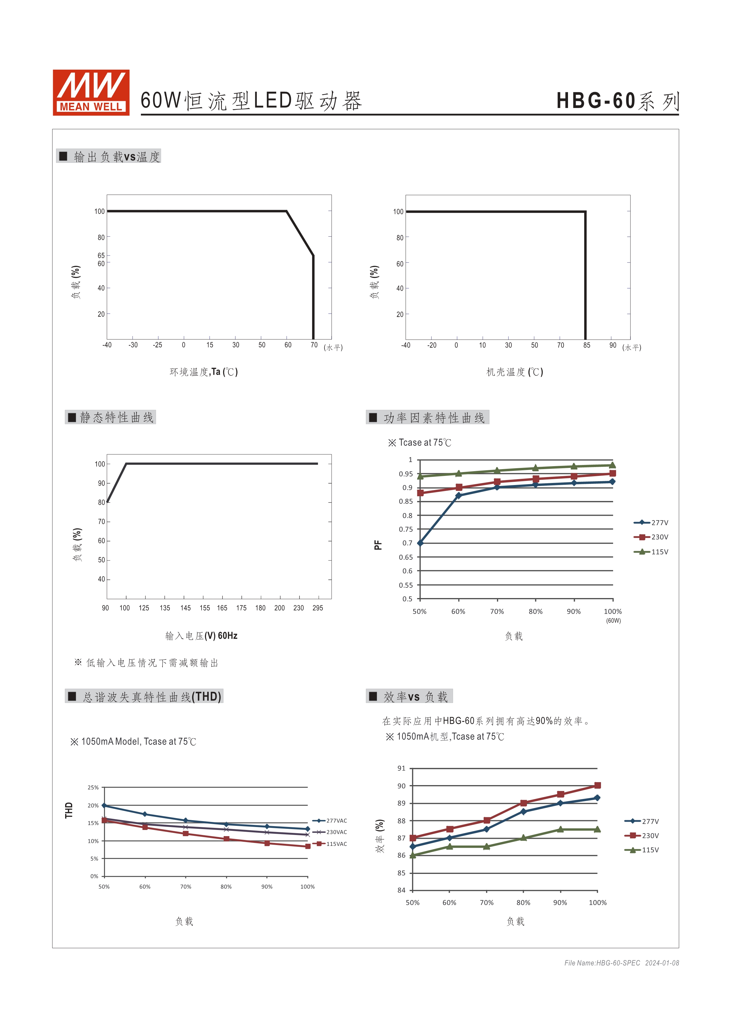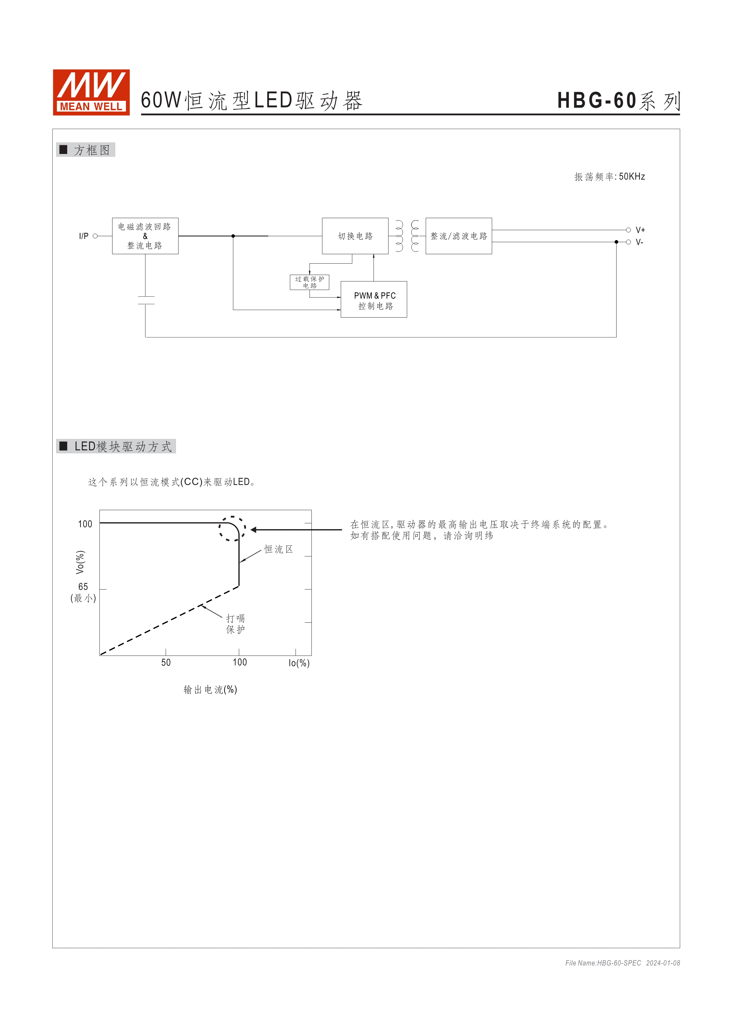 圓形外殼設(shè)計(jì) : HBG-60 :塑料外殼; HBG-100/160/240 :金屬外殼; HBG-60P/100P/160P/240P : PCB板型 90~305VAC交流輸入(HBG-60為90~295VAC), 內(nèi)建主動(dòng)式功率因子矯正功能(active PFC) IP67/IP65防護(hù)等級(jí)可用于戶外與室內(nèi)(HBG-100/160/240) HBG-100(P)/160(P)/240(P) B Type機(jī)種內(nèi)建三合一調(diào)光功能 (1~10VDC,PWM信號(hào)或電阻) Type "HL" LED電源適用在安裝于Class I, Division 2 類(lèi) 危險(xiǎn)地點(diǎn)之照明燈具(HBG-100/160) 適合于LED天井燈、舞臺(tái)燈、投光燈等照明應(yīng)用 5年保固期