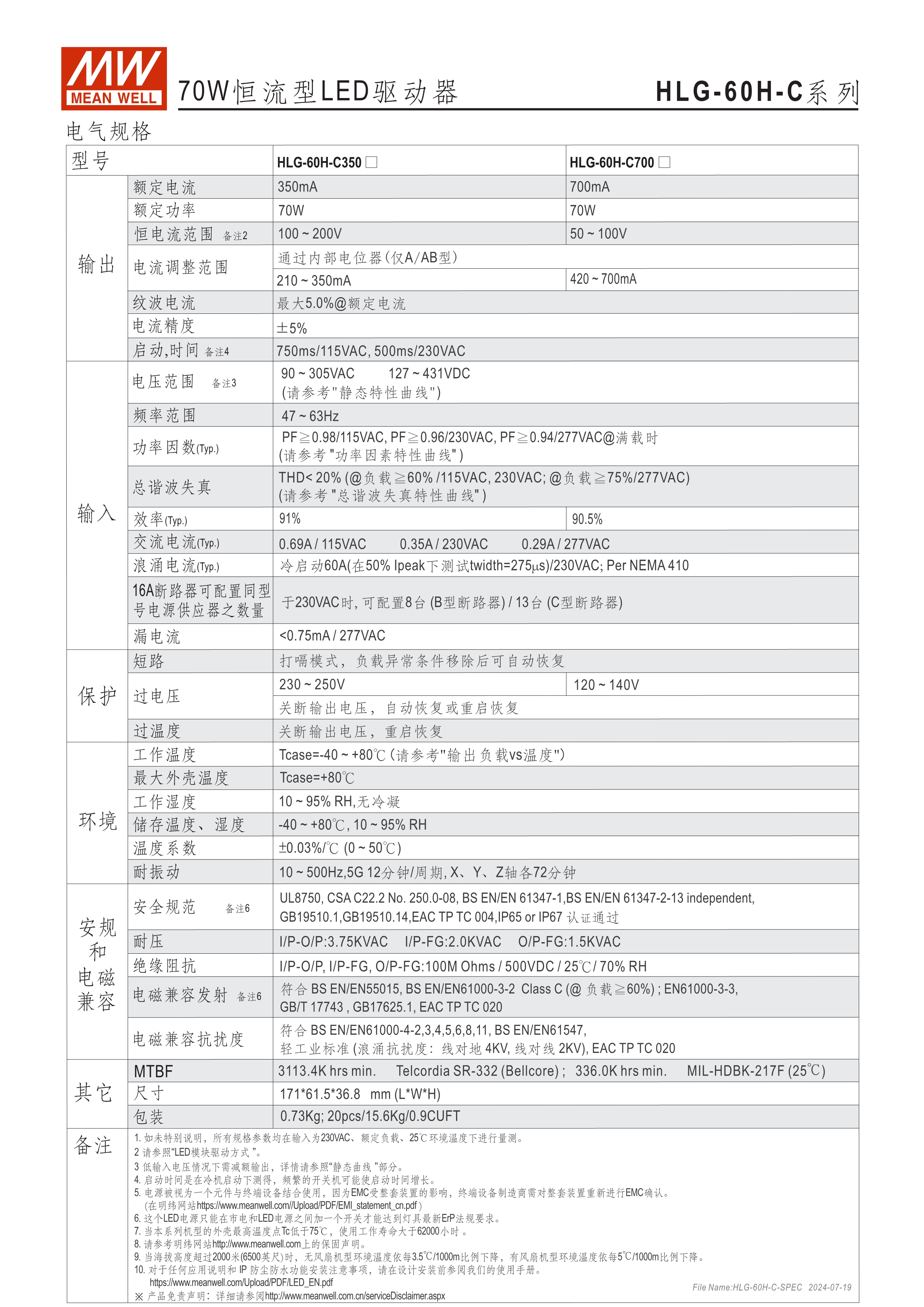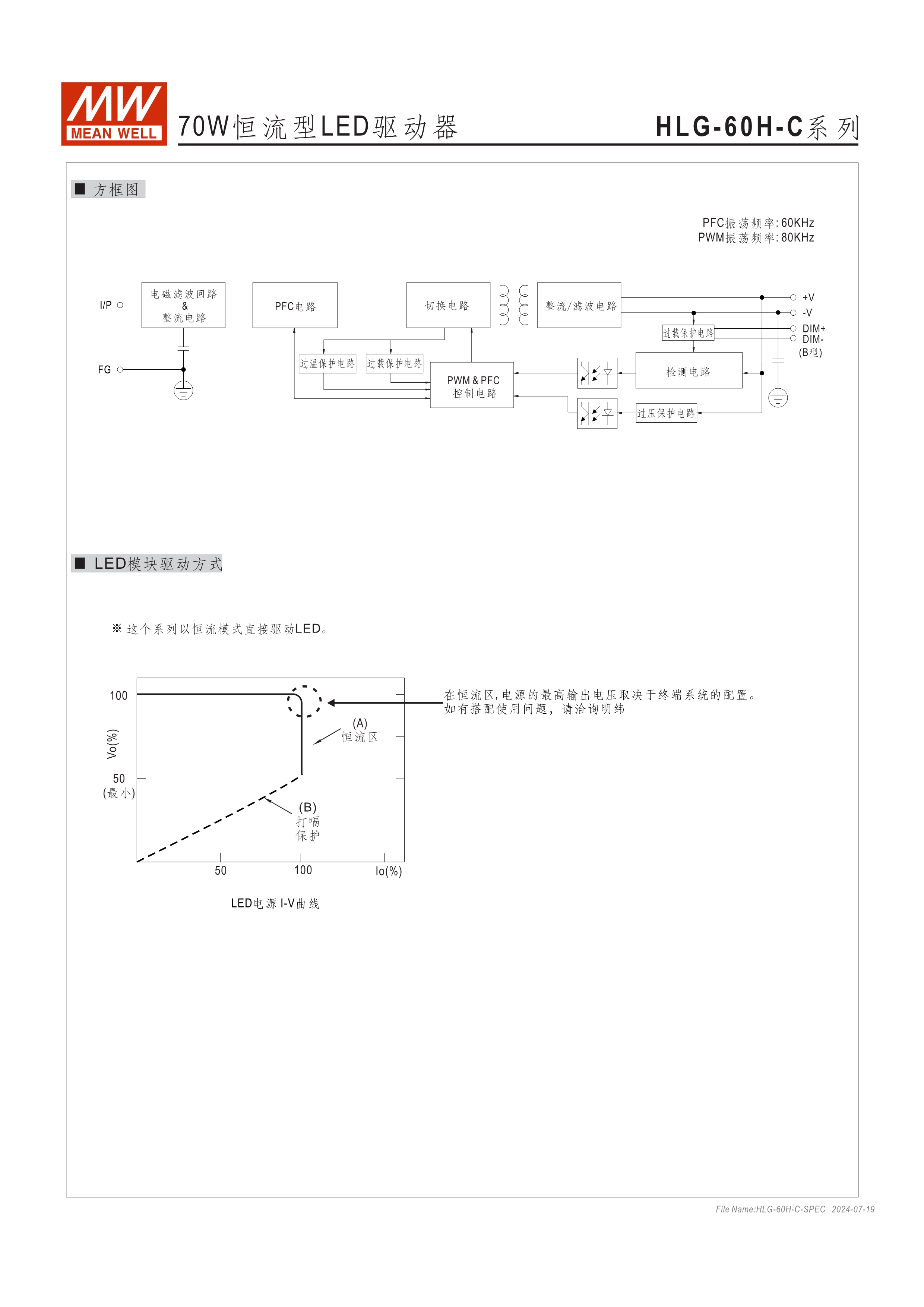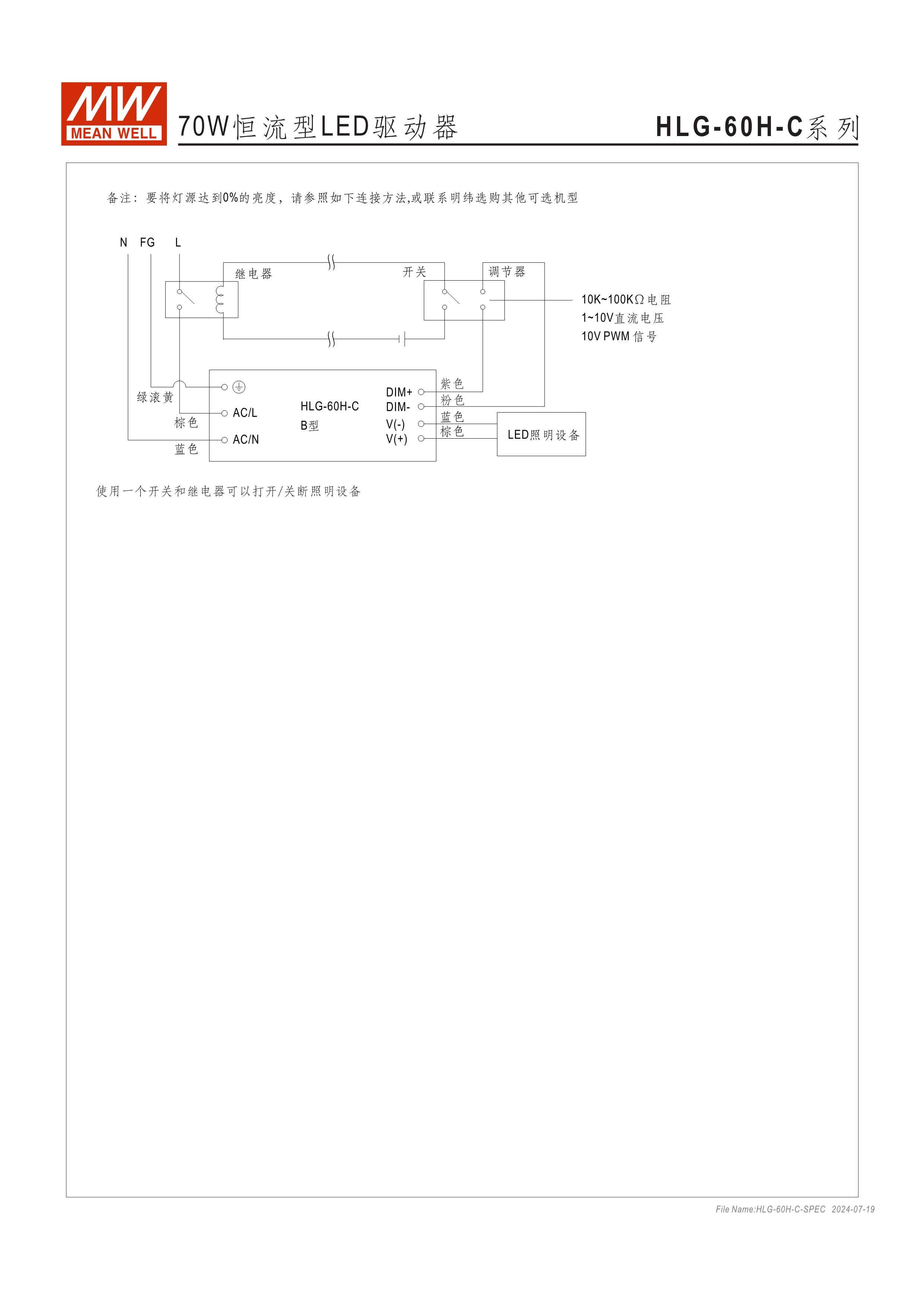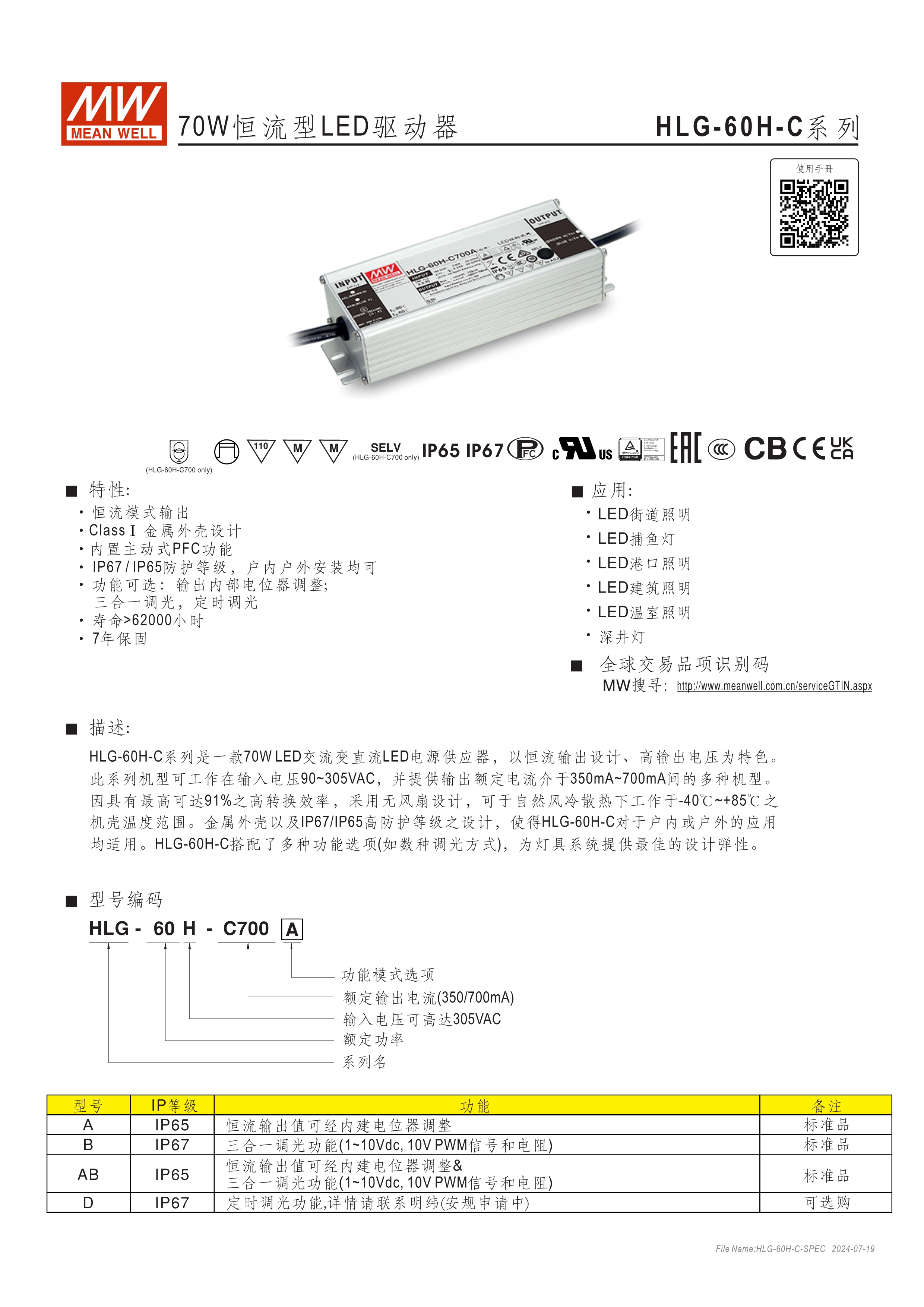 90~305VAC交流輸入,內(nèi)建主動式功率因子矯正功能(active PFC) 高壓(大于60VDC)恒流輸出機種 金屬外殼,IP67/IP65防護等級可用于戶外與室內(nèi) 功能選項 : 輸出可經(jīng)由電位器調(diào)整;三合一調(diào)光(1~10Vdc或10V PWM信號或電阻);定時調(diào)光;智能定時調(diào)光 Type "HL" LED電源適用在安裝于Class I, Division 2 類 危險地點之照明燈具 (僅HLG-240H-C/320H-C) 適合于LED路燈及戶外LED照明等應用 7年保固期