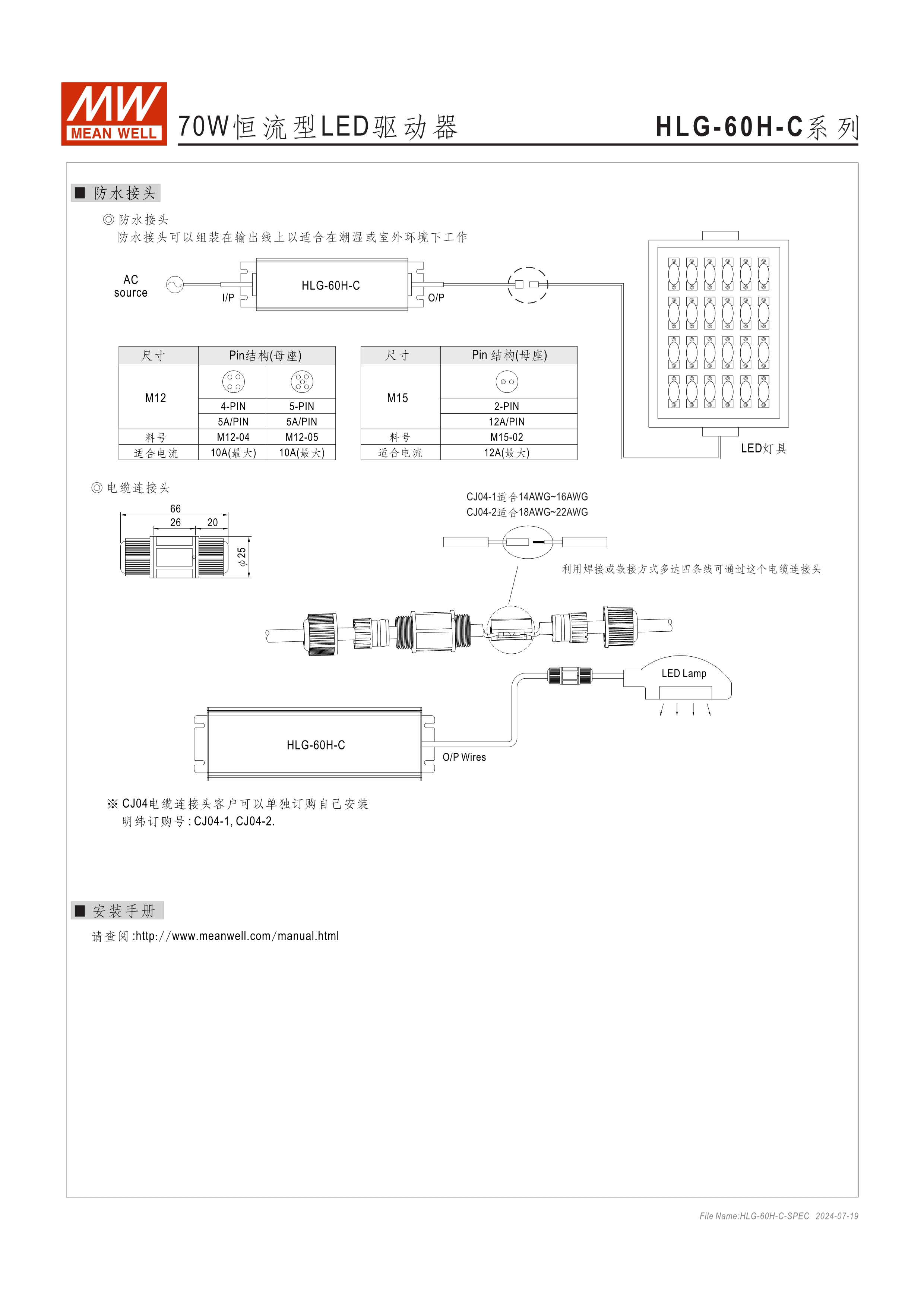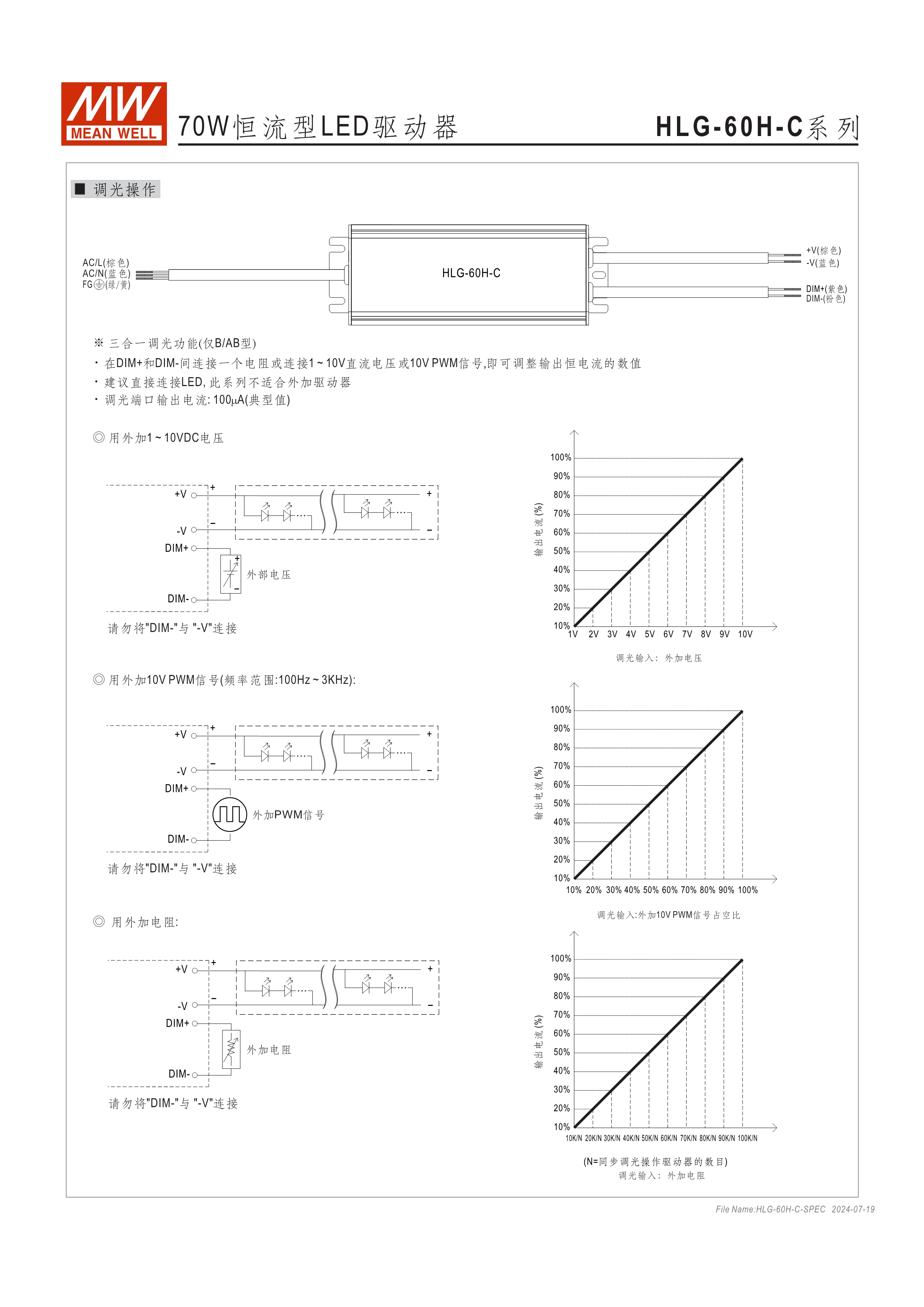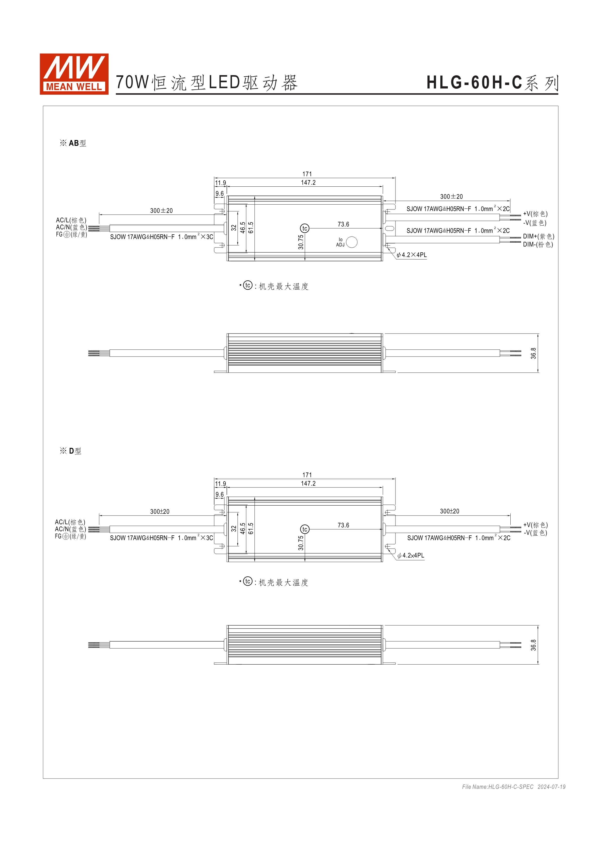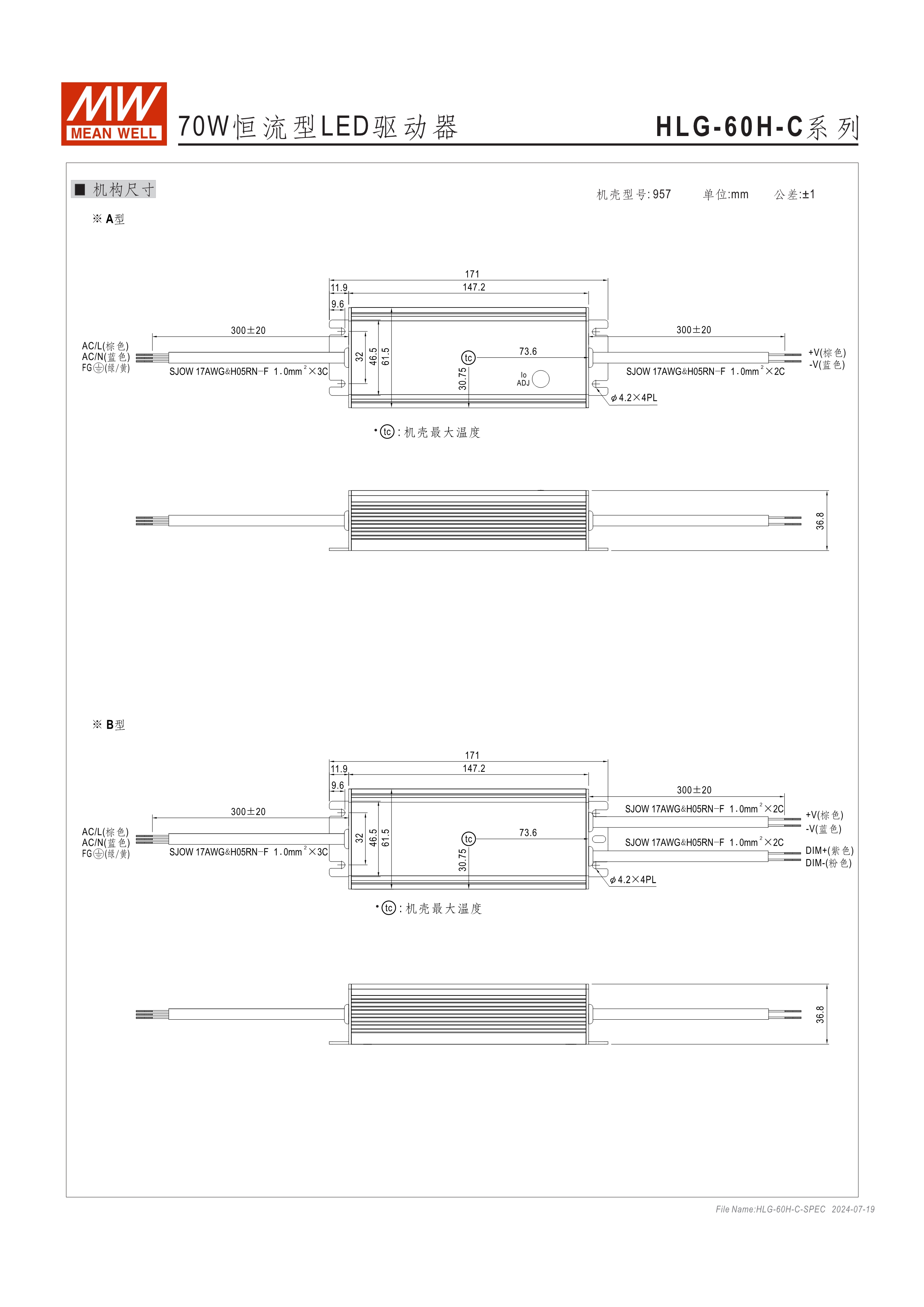 90~305VAC交流輸入,內(nèi)建主動式功率因子矯正功能(active PFC) 高壓(大于60VDC)恒流輸出機種 金屬外殼,IP67/IP65防護等級可用于戶外與室內(nèi) 功能選項 : 輸出可經(jīng)由電位器調(diào)整;三合一調(diào)光(1~10Vdc或10V PWM信號或電阻);定時調(diào)光;智能定時調(diào)光 Type "HL" LED電源適用在安裝于Class I, Division 2 類 危險地點之照明燈具 (僅HLG-240H-C/320H-C) 適合于LED路燈及戶外LED照明等應用 7年保固期