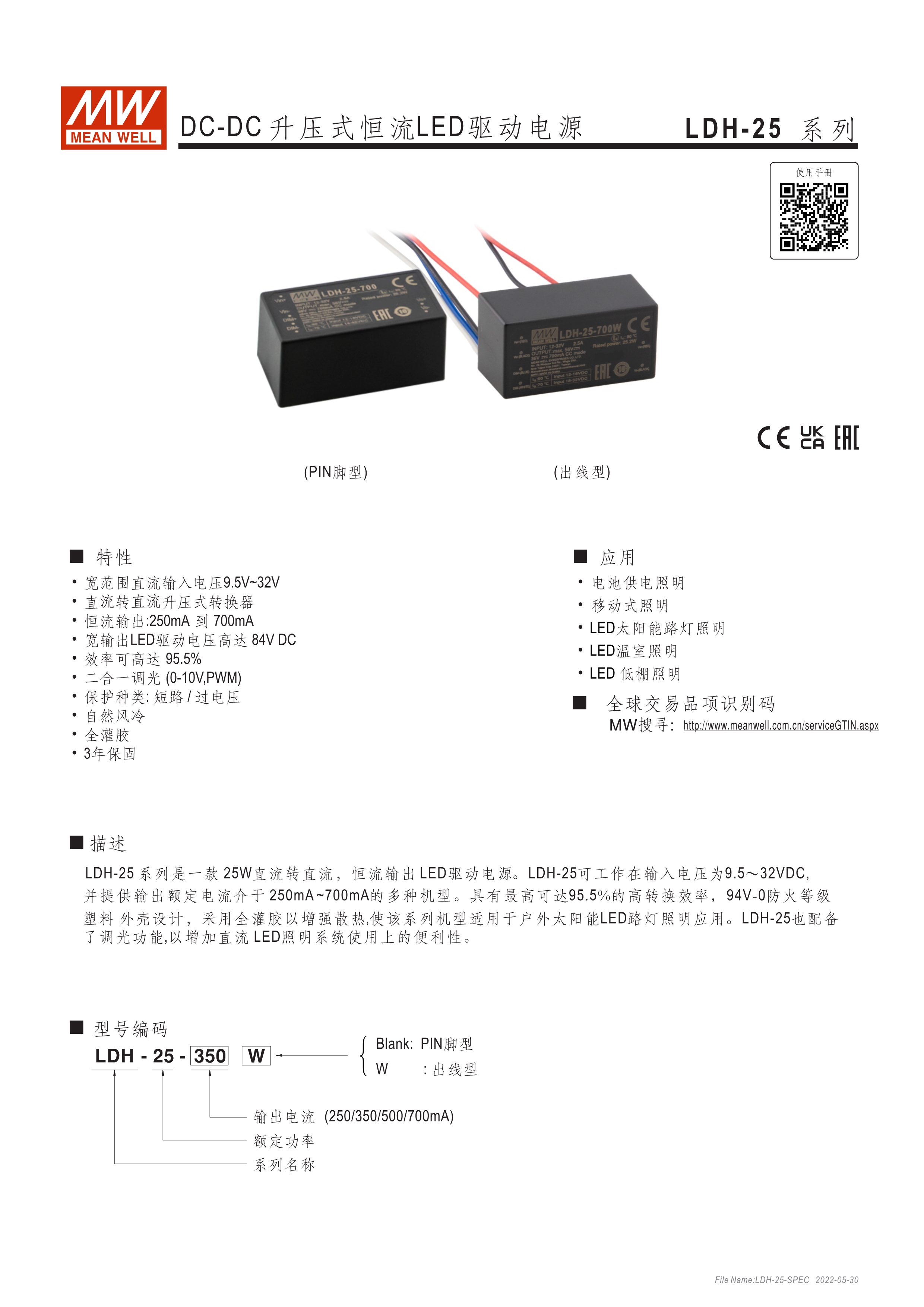 DC/DC升壓式恒流輸出LED驅(qū)動(dòng)器 95%超高效率 不需外接任何組件即可符合EN55015 內(nèi)建PWM+模擬調(diào)光功能及開/關(guān)遙控功能 適合于升壓型照明系統(tǒng)(需插件于PCB母板上) 具備插pin及出線兩種型式