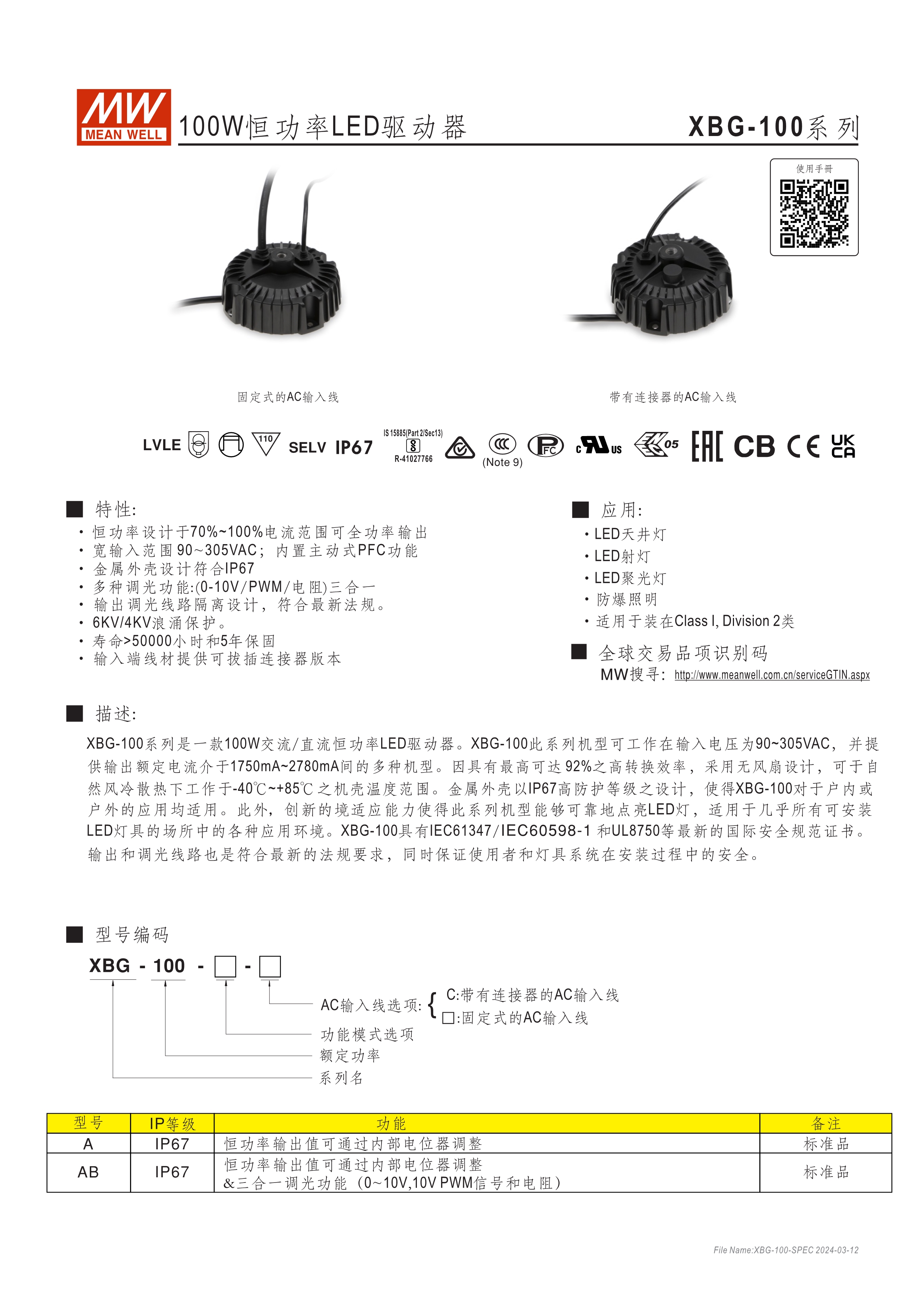 寬電壓范圍100~305VAC交流輸入 主動式PFC及定功率恒流設(shè)計(jì) 輸入線材增加防水接頭方便使用 雷擊保護(hù)設(shè)計(jì):6KV/4KV 保護(hù)種類:短路、過電壓、過溫度 產(chǎn)品壽命>50,000 hrs and 5年保固