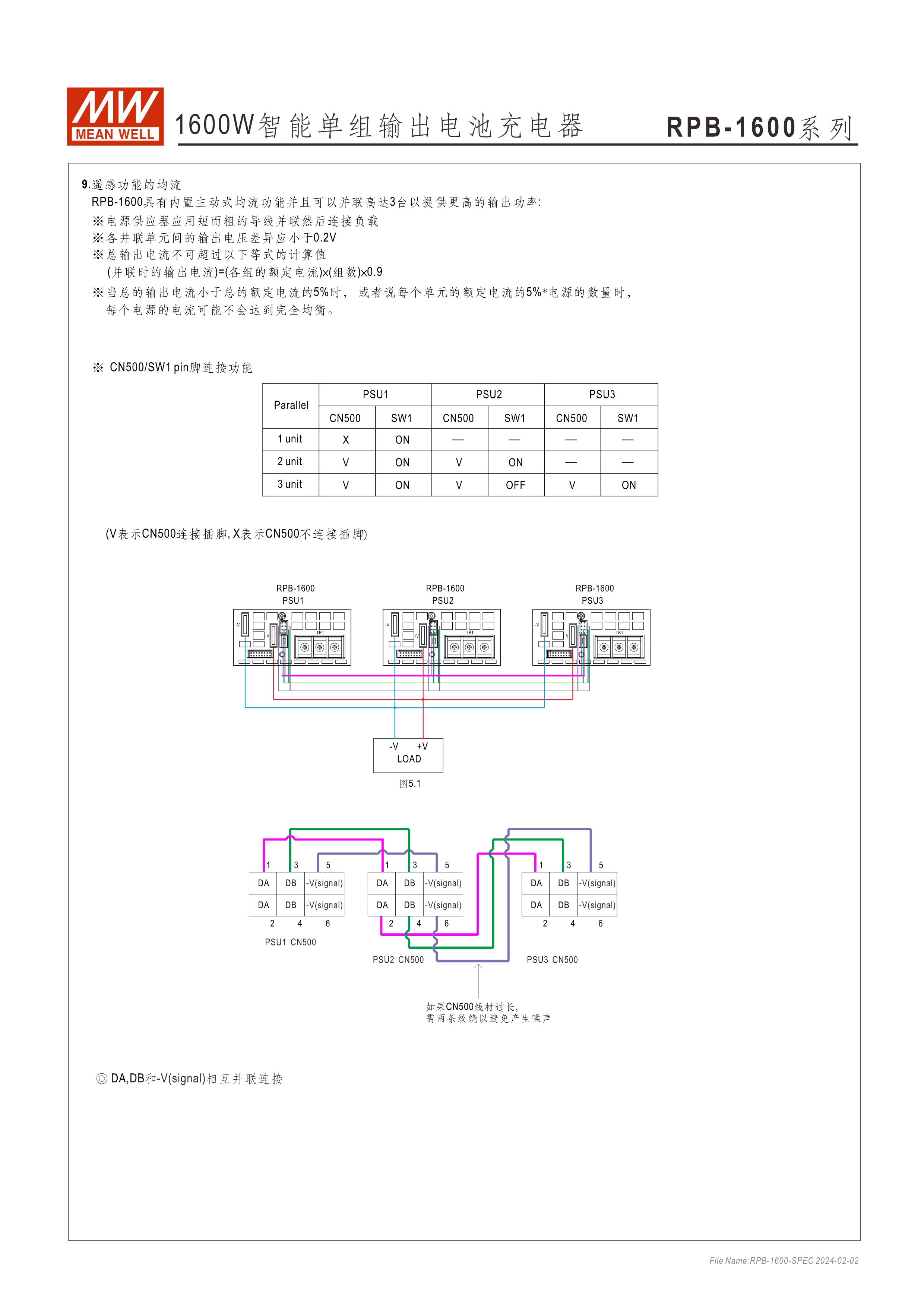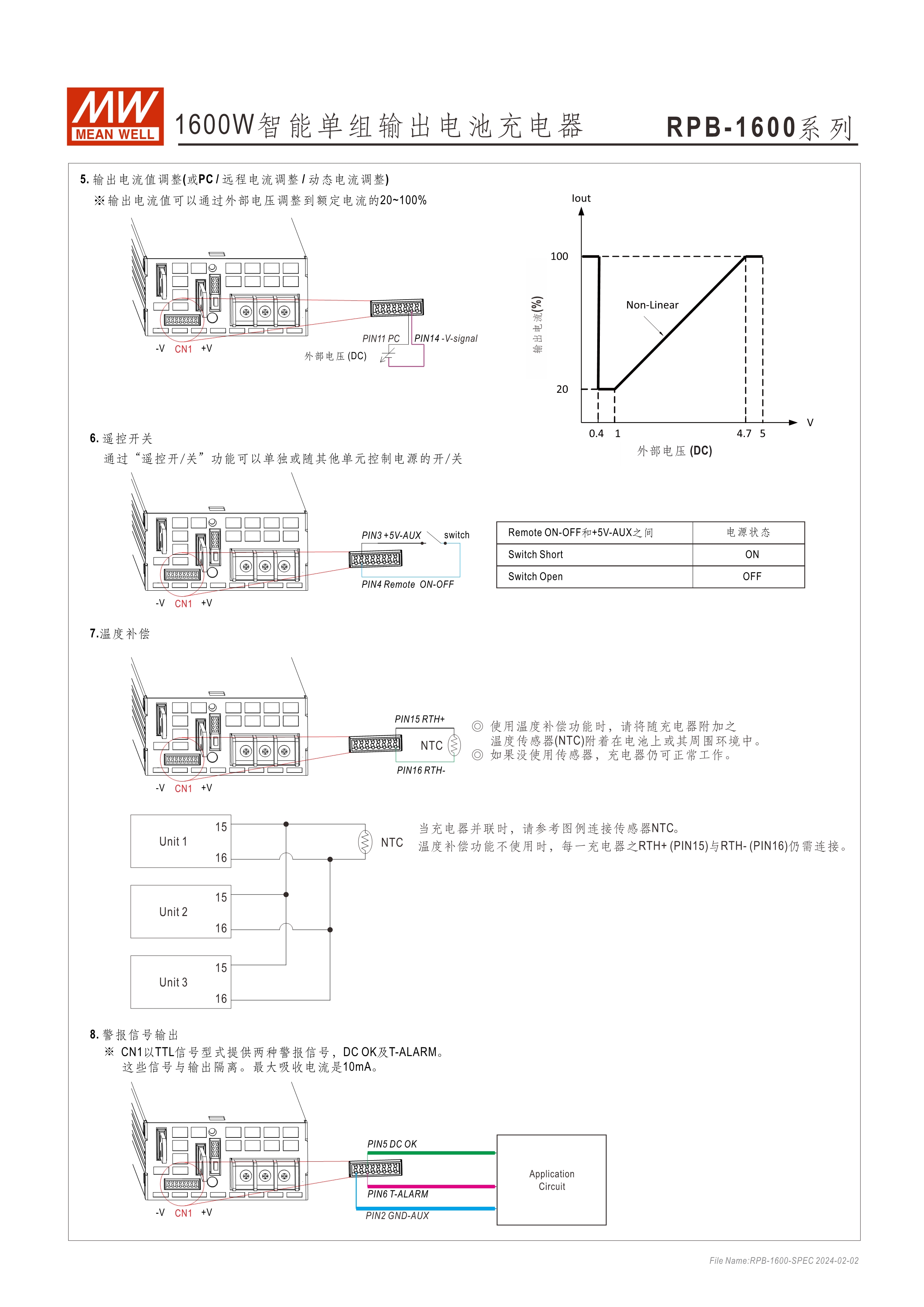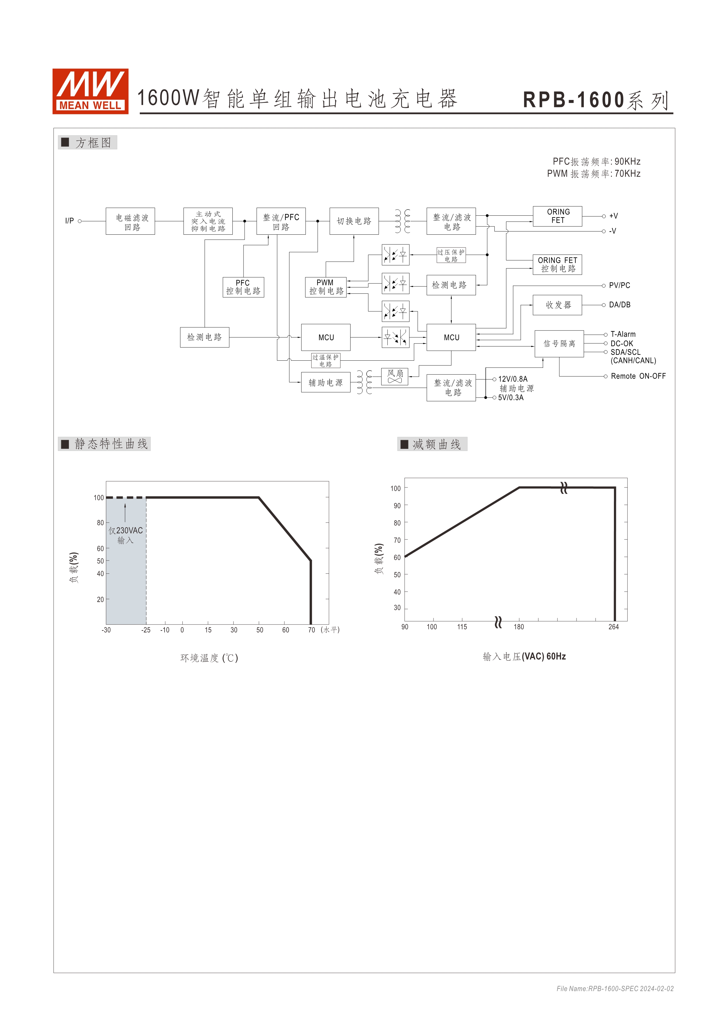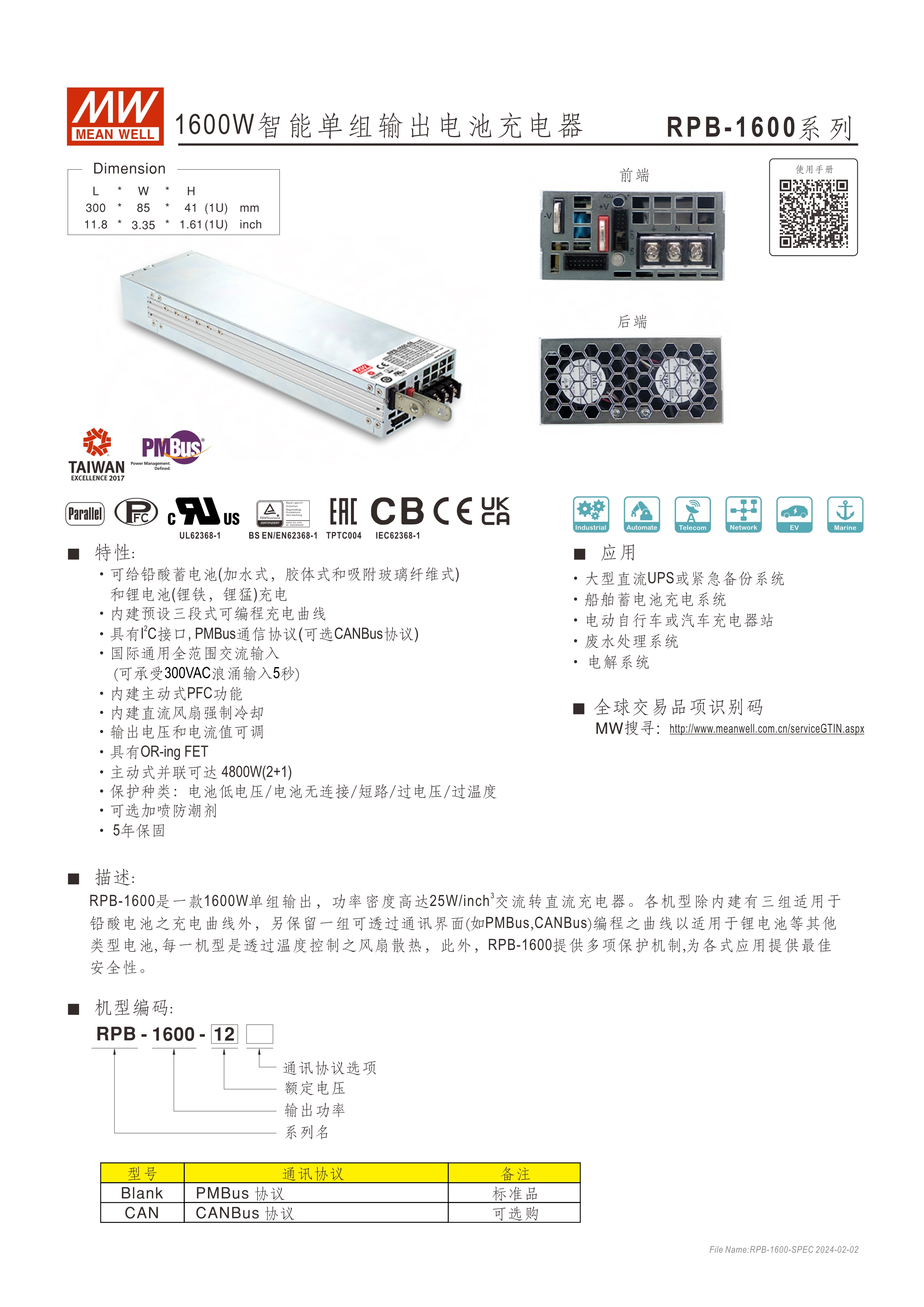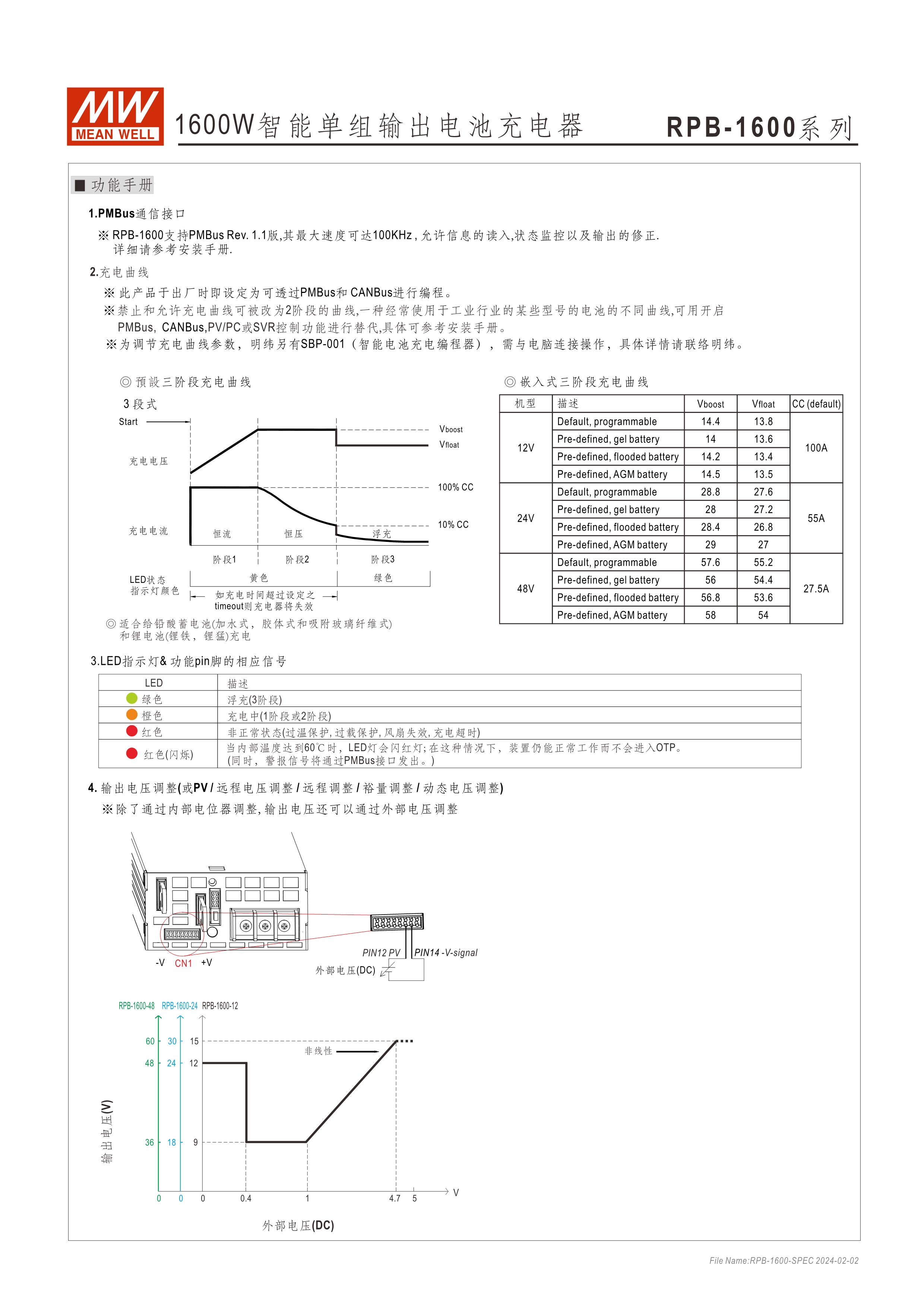 RPB/DBU系列:機(jī)殼型充電器 RCB/DBR系列:Rack機(jī)架型充電器 功率密度高達(dá)37W/in3 內(nèi)建I2C/PMBus通訊介面 (CANBus選購(gòu)) 搭配SBP-001編成器,可設(shè)定充電電壓/電流、2段或3段、停充時(shí)間 透過(guò)外加1~5Vdc,可調(diào)充電電壓75~125% (10.8~18V,21.6~36V, 43.2~72V) 藉由外加1~5Vdc,可調(diào)充電電流20~100% 內(nèi)建OR_ing MOSFET,支援熱插拔 (僅RCB-1600/DBR-3200系列) 均流并聯(lián)最高可達(dá)25600W 保護(hù)功能:電池過(guò)低、未接好、短路、過(guò)溫度 通用鉛酸電池或鋰電池 5年保固