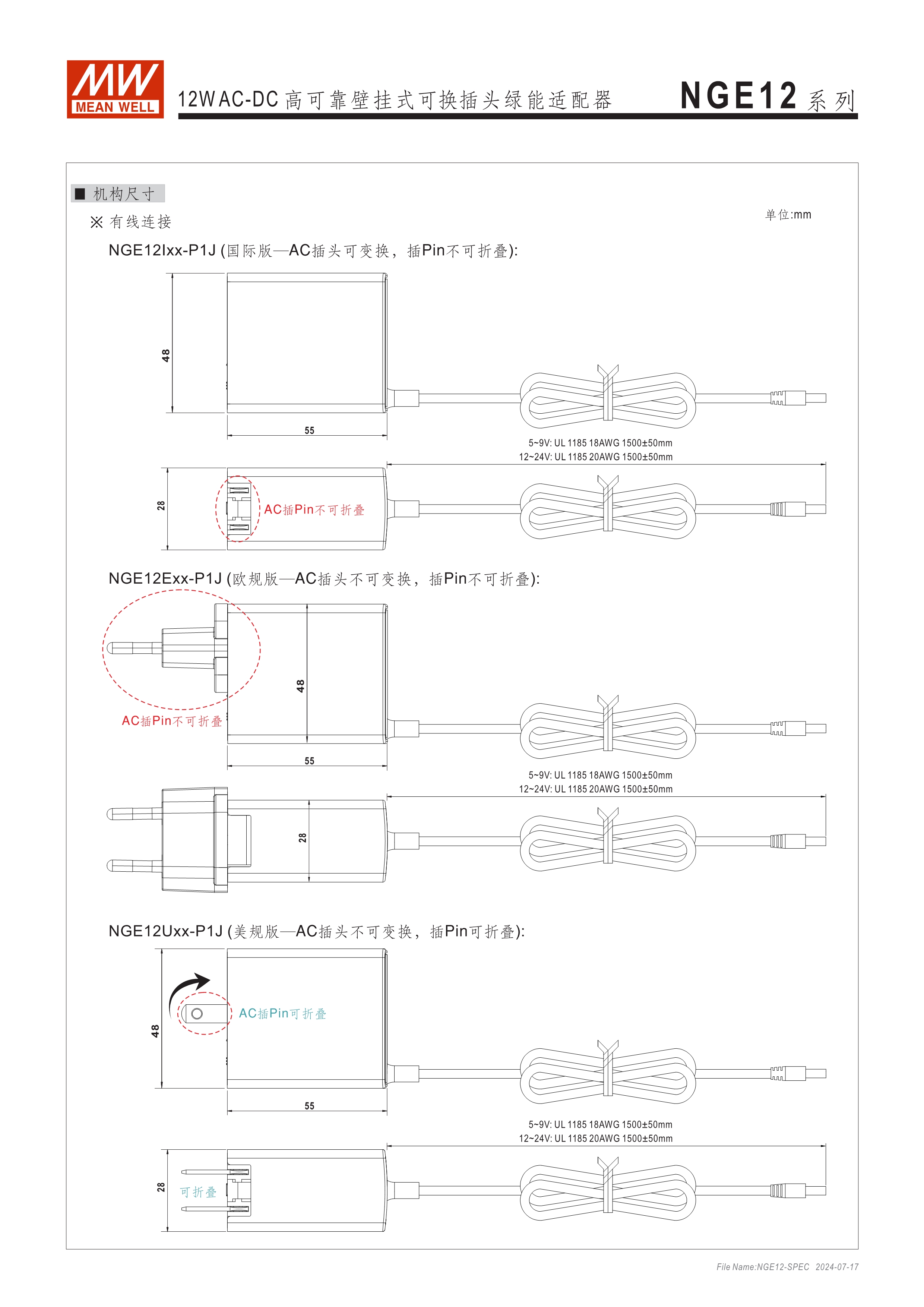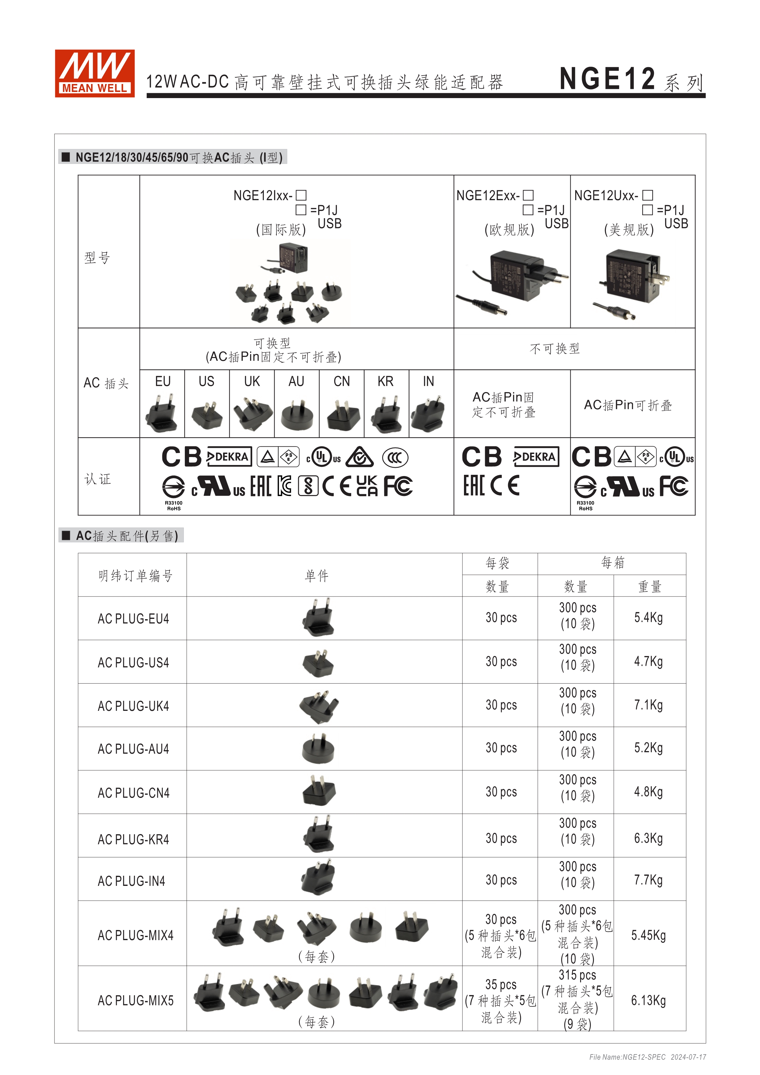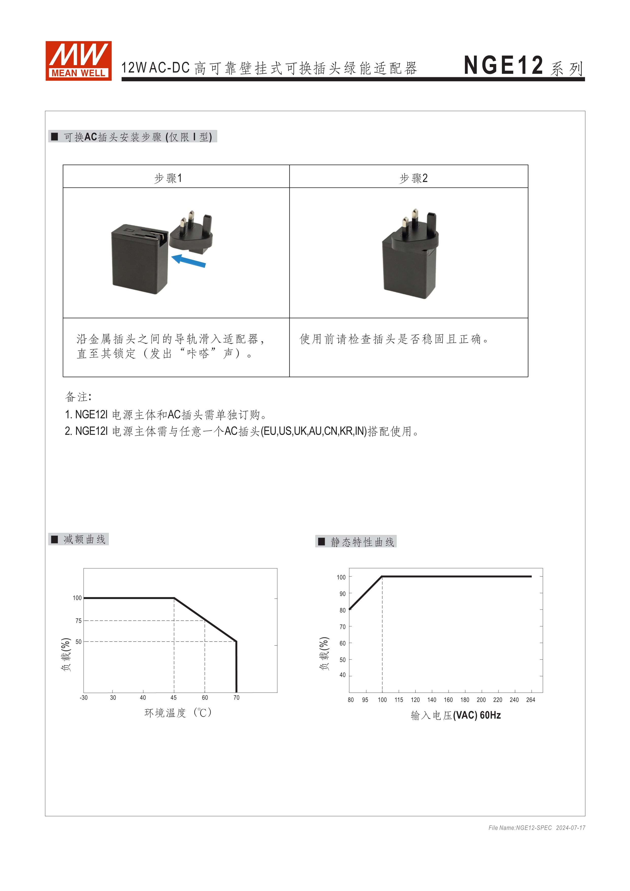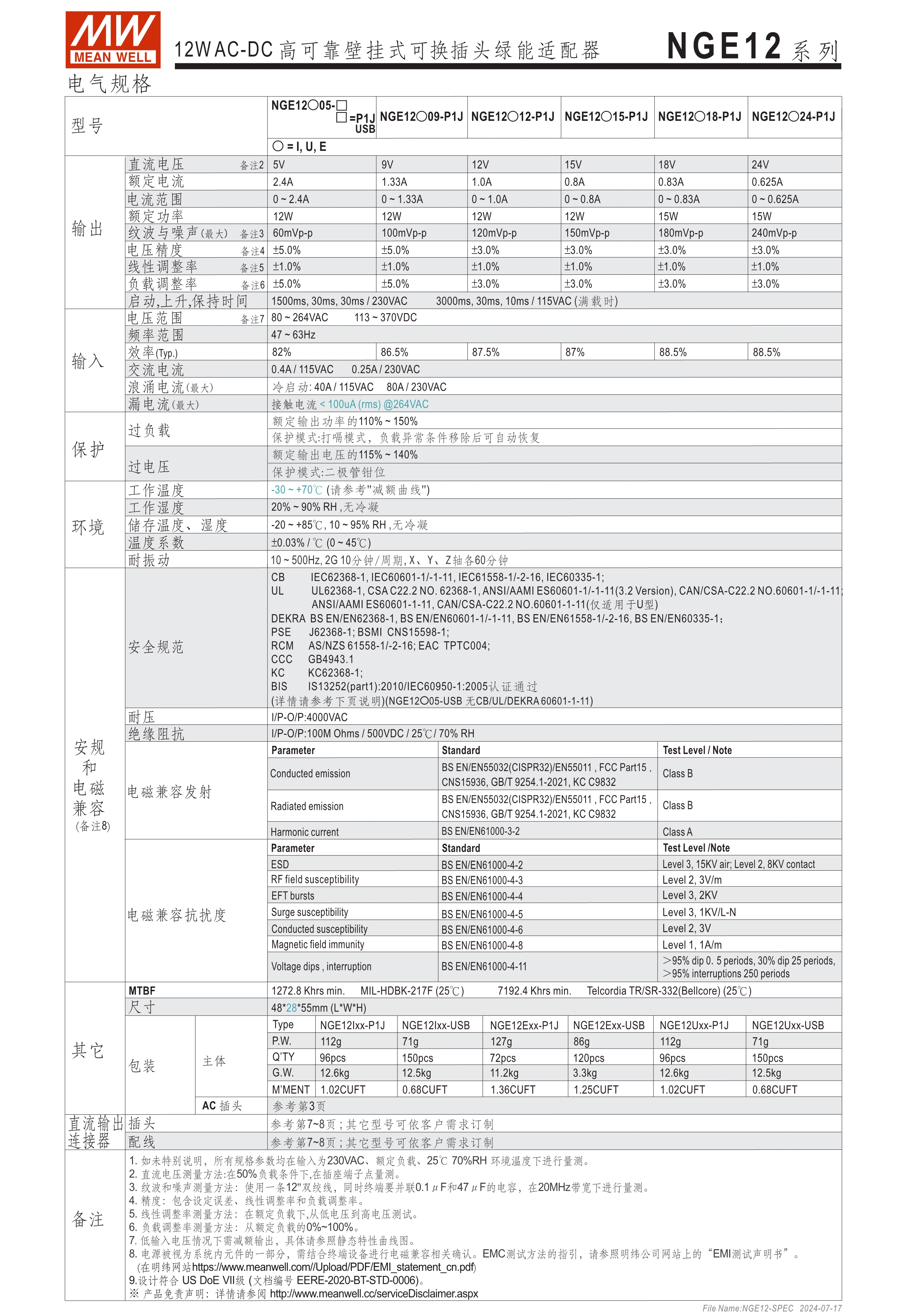 可換AC插頭 符合多領(lǐng)域全球認(rèn)證 (信息類(lèi) 62368-1、醫(yī)療 60601-1, 家用 60335-1、工業(yè) 61558-1/-2-16) 全范圍AC輸入 2xMOPP, BF應(yīng)用 超窄面寬設(shè)計(jì)(28mm~30mm) 漏電流 <100uA 80~264V輸入 空載損耗<0.075W~0.1W 能效等級(jí)Level VII 保護(hù)功能:短路、過(guò)載、過(guò)電壓 漏電流 <100uA -30~70℃寬工作溫度 多種DC輸出轉(zhuǎn)接頭可更換 3年保固期