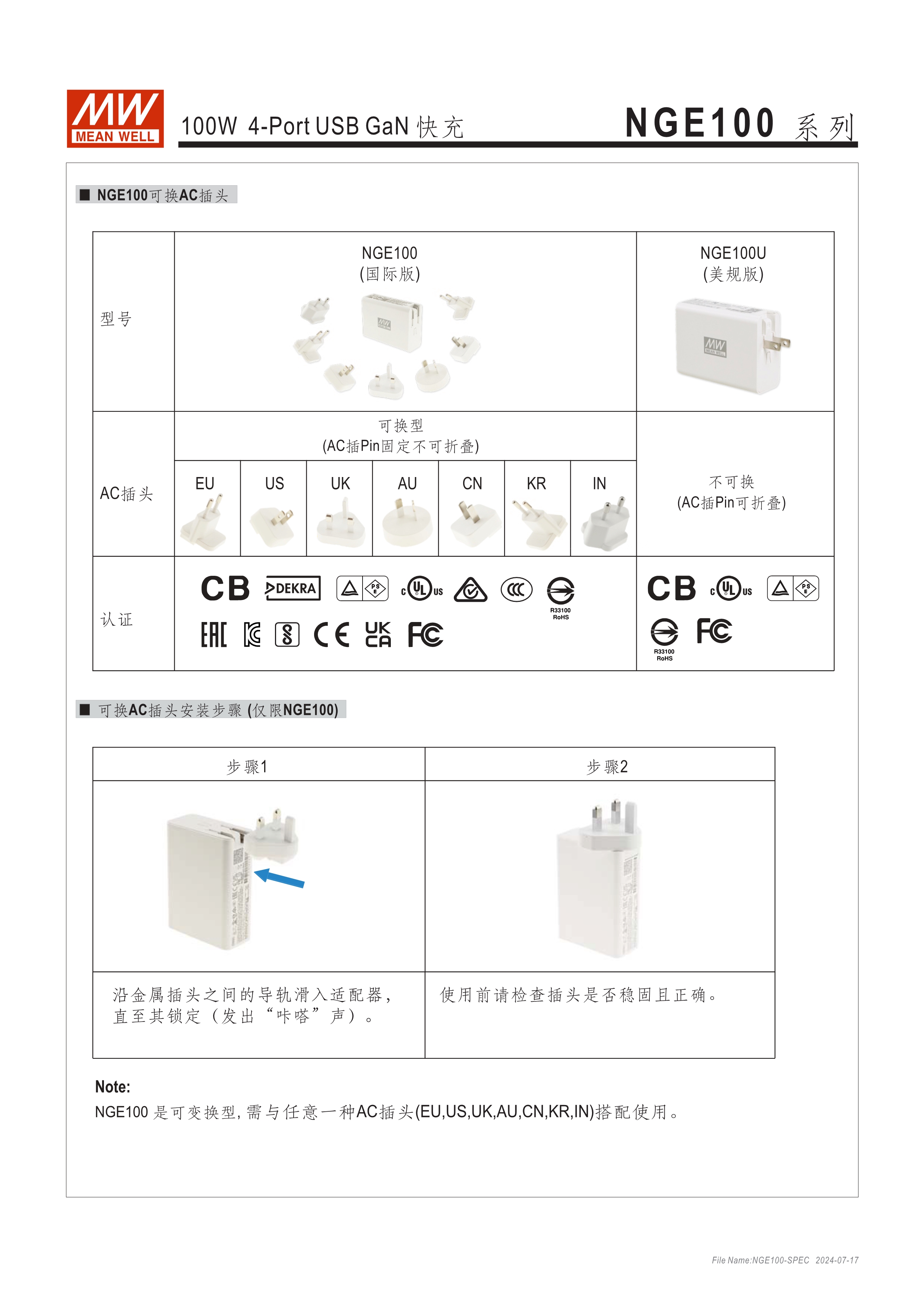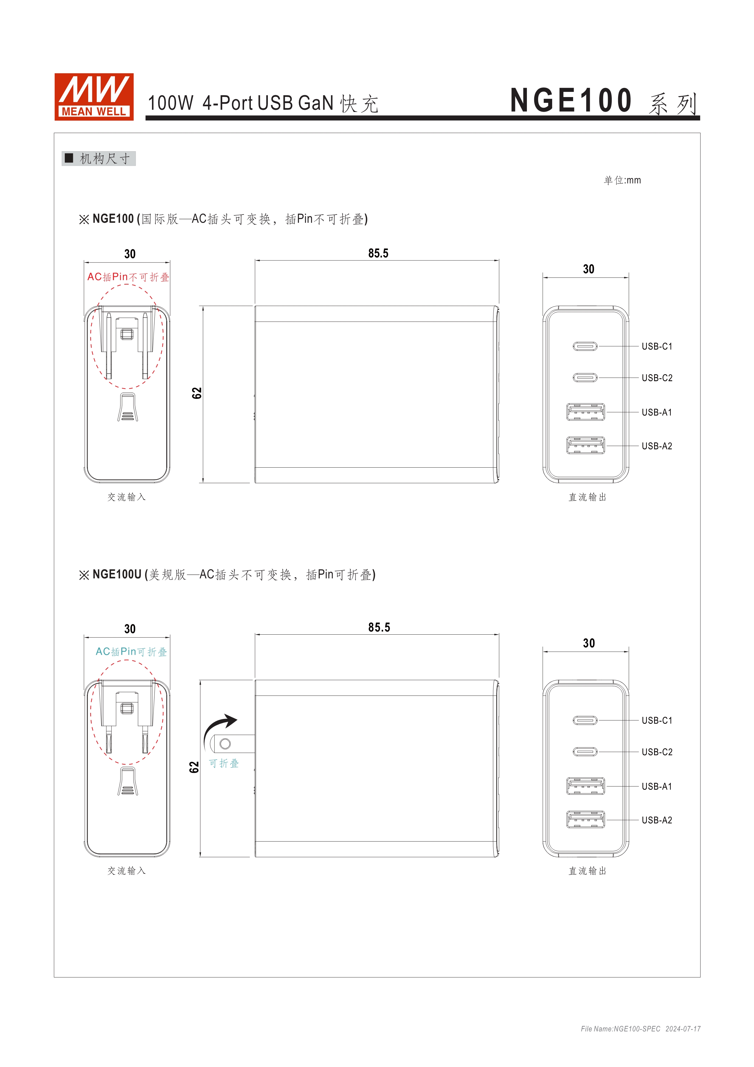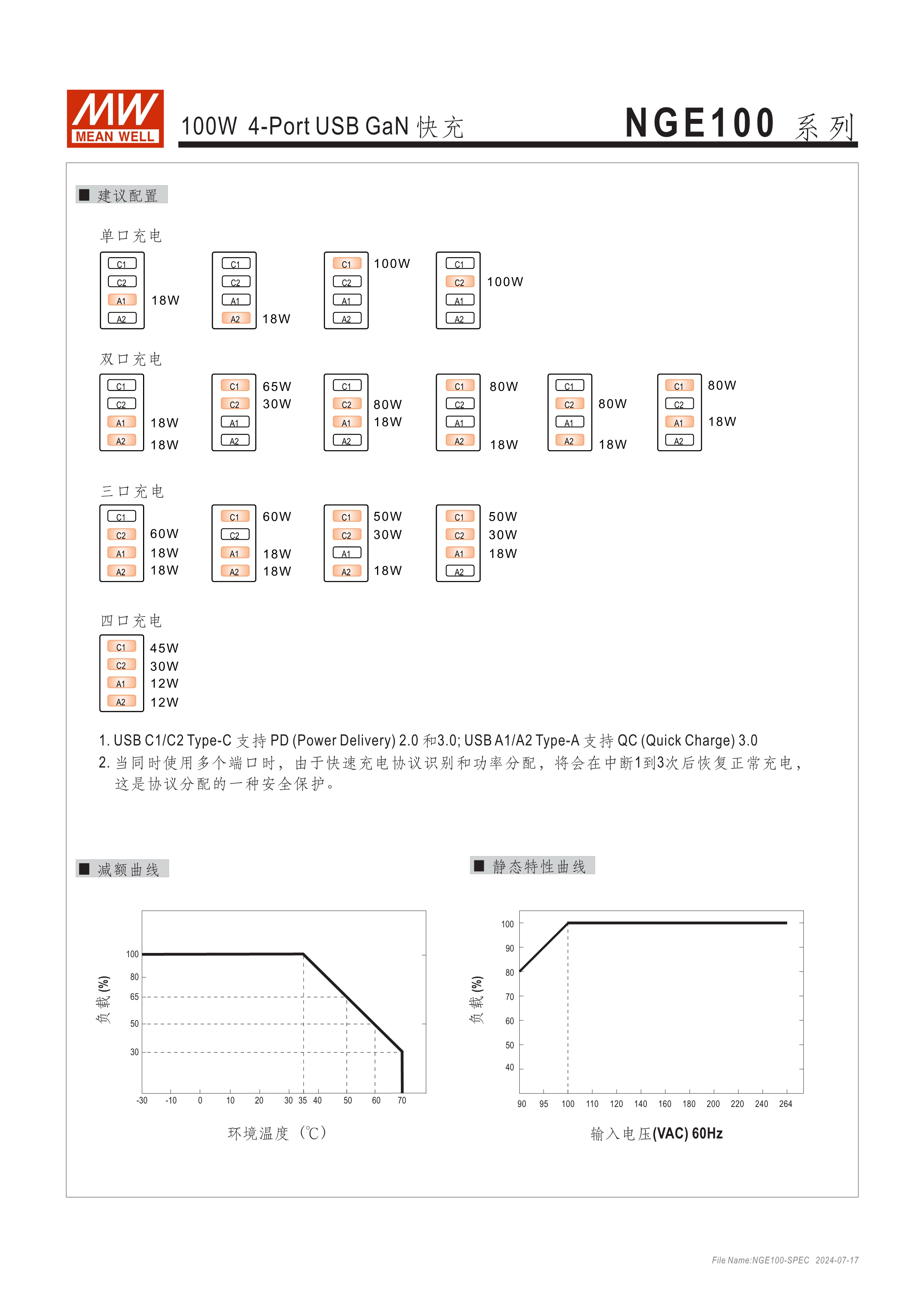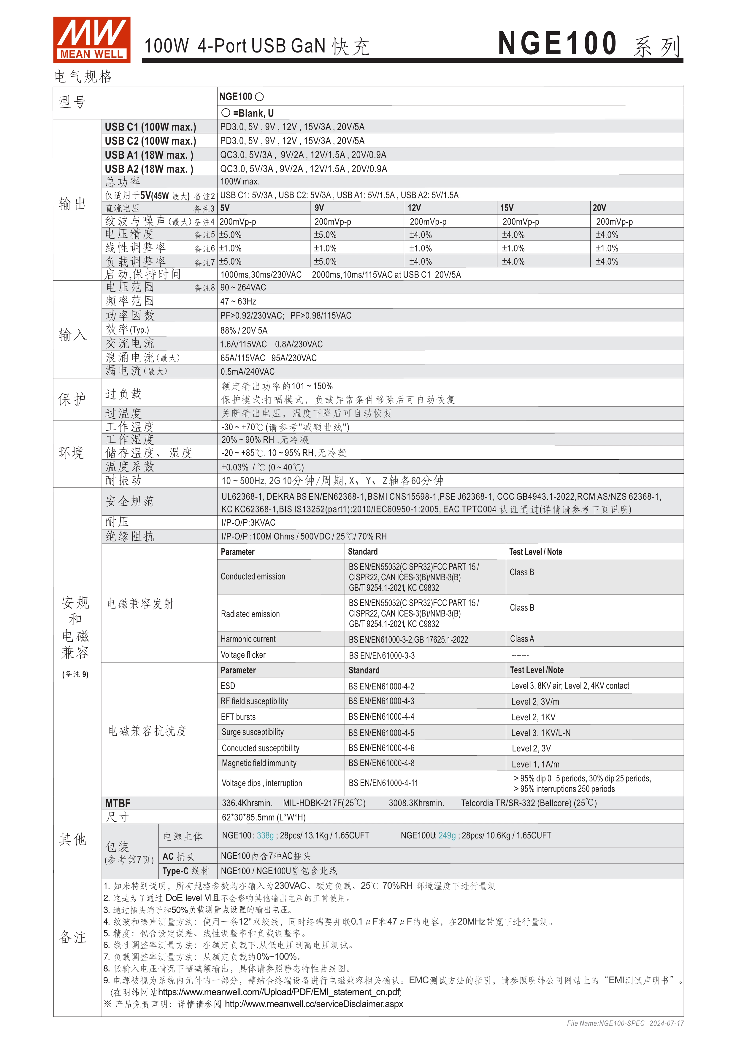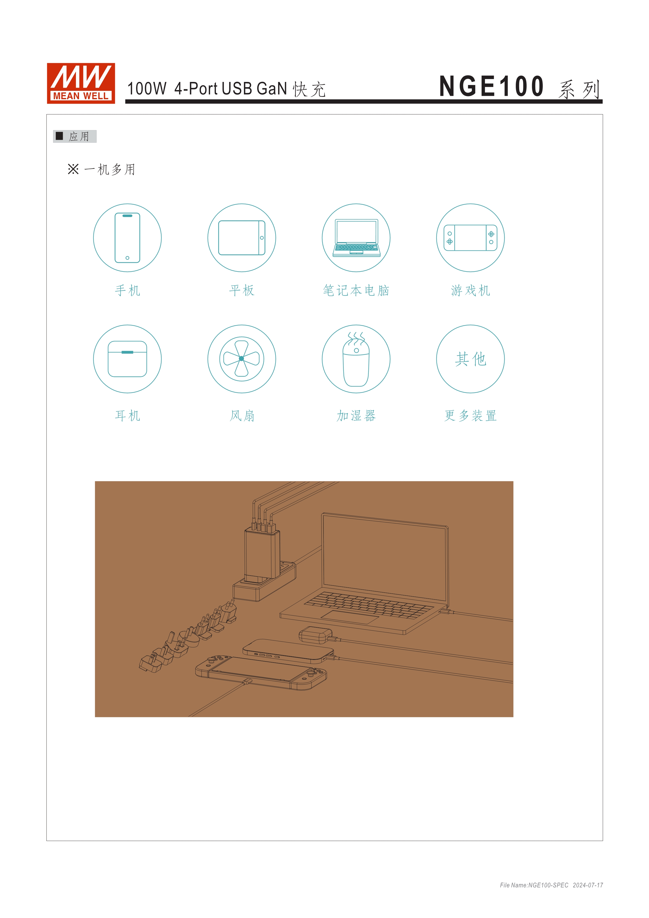 一臺(tái)可同時(shí)充多種裝置 國際版: AC插頭可變換(NGE100); 美規(guī)版: AC插頭不可換,可折疊(NGE100U) 全球國際認(rèn)證 USB-2C2A,4-Port皆可獨(dú)立快充 USB-C單port可支援最高100W快充 支援QC2.0、QC3.0、PD3.0 自動(dòng)偵測電壓:5V/ 9V/ 12V/ 15V/ 20V 保護(hù)功能 : 短路、過載、過溫 空載損耗<0.3W 能效等級(jí)Level VI 尺寸小巧 (62x 30x 85.5mm) 附贈(zèng)兼具充電及資料傳輸?shù)腡ype-C線 (100cm) 3年保固