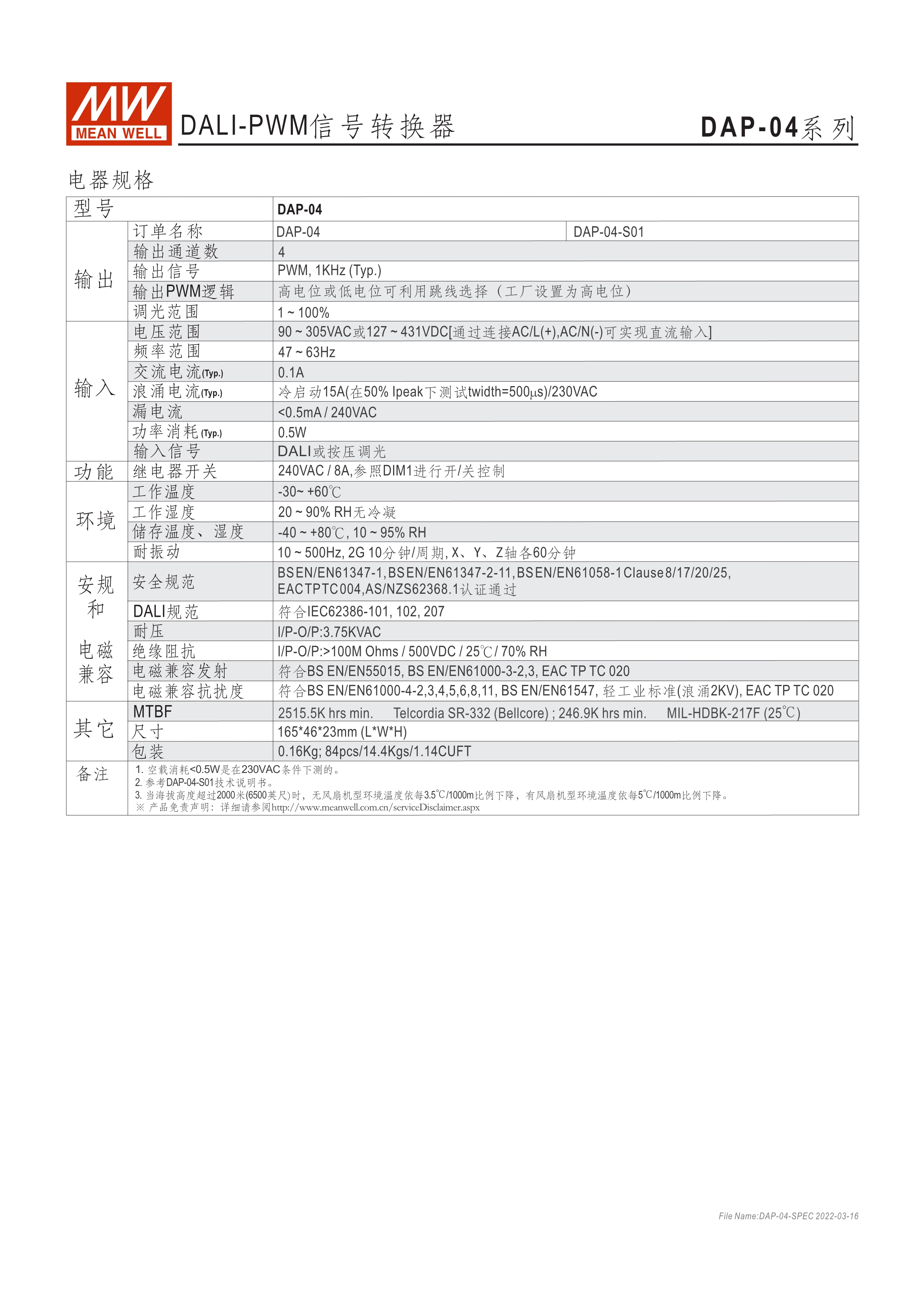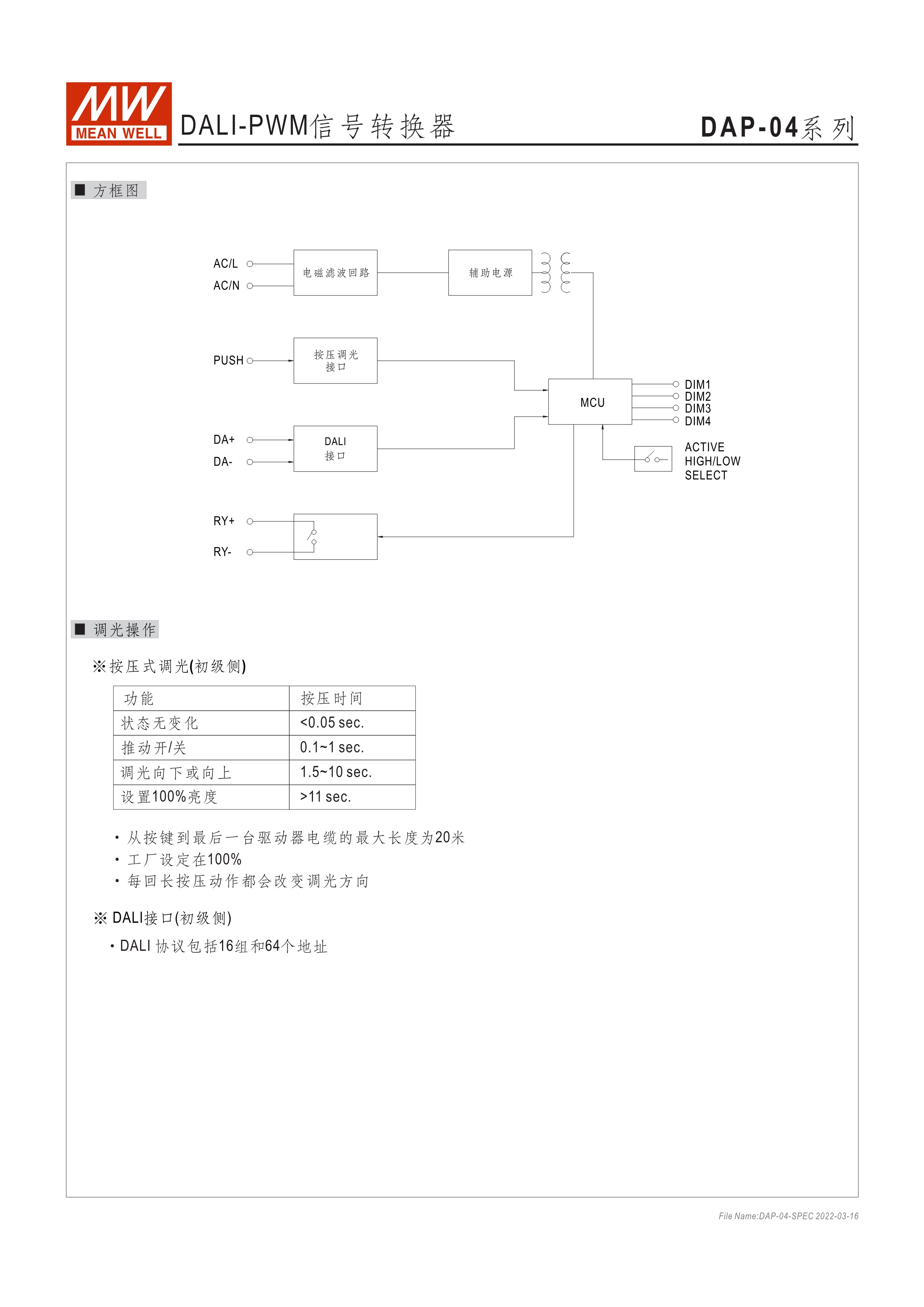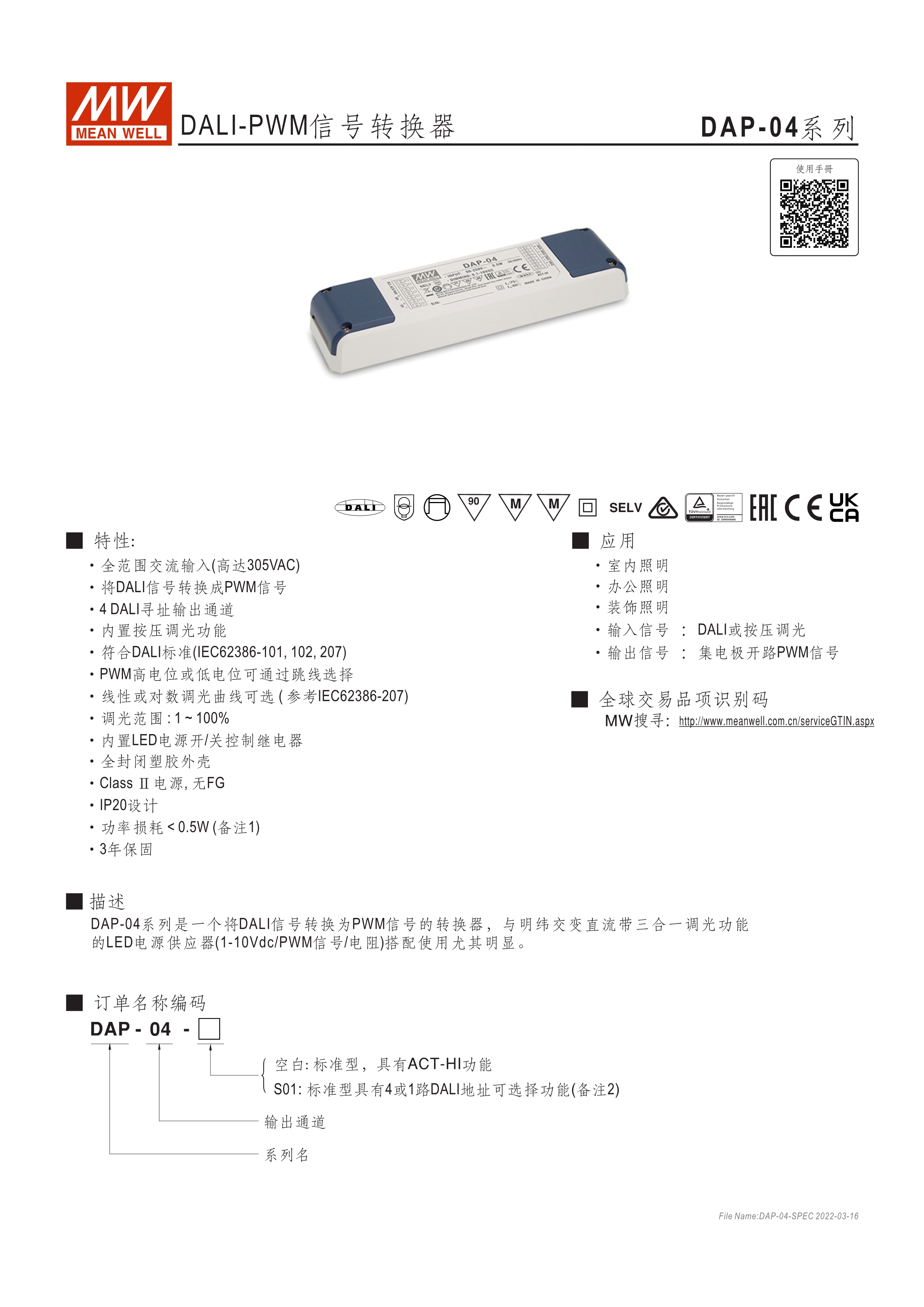 90~305VAC交流輸入 DALI訊號轉(zhuǎn)換為PWM訊號 4組DALI可尋址輸出通道 符合DALI標準(IEC62386-101, 102, 207) 適合與明緯具3合1調(diào)光功能之AC/DC LED電源供應器搭配使用