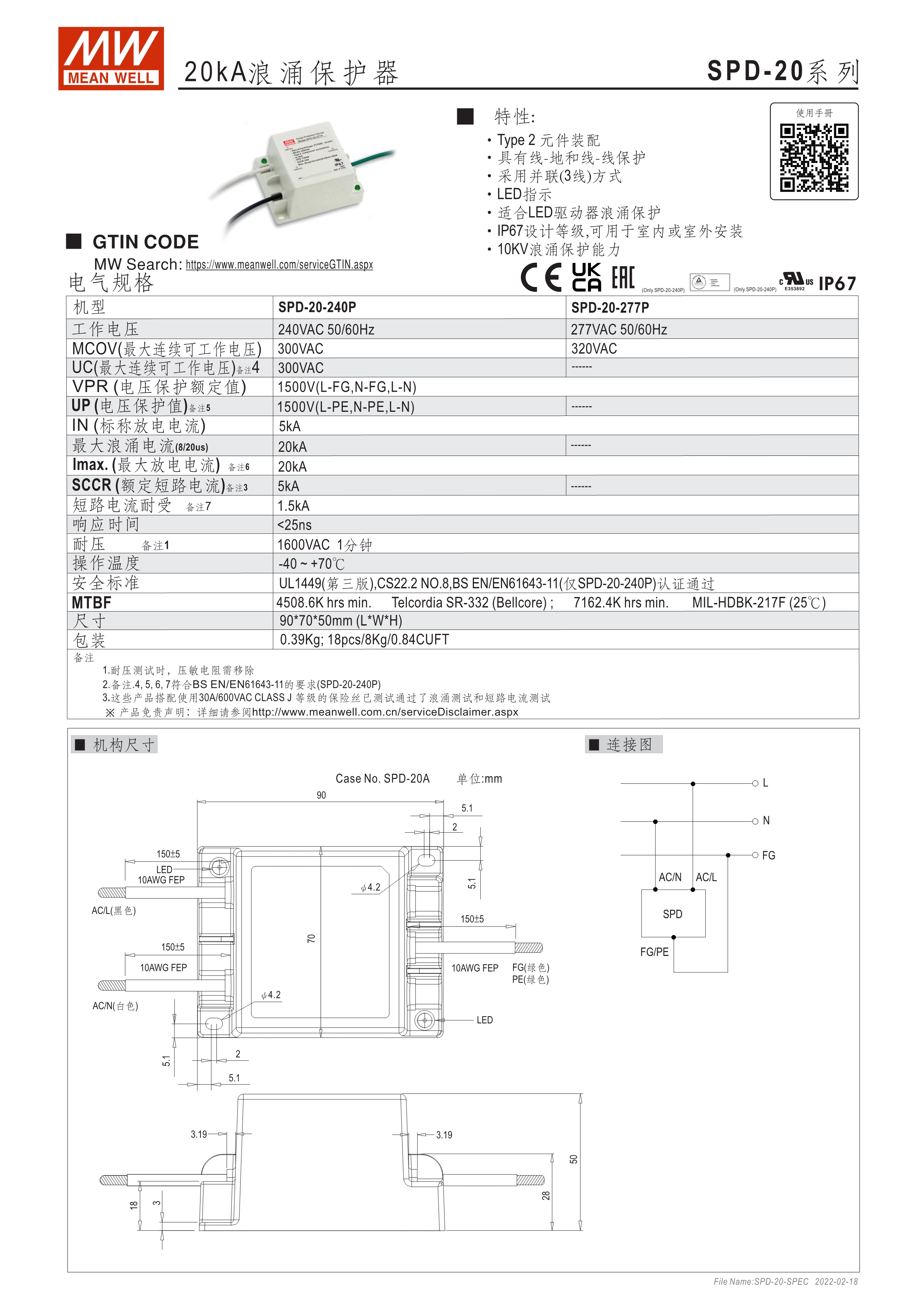 10kA/20kA雷擊突波保護(hù)器 線對地與線對線保護(hù) 適合于雷擊瞬間保護(hù)LED電源 IP66/67設(shè)計等級,適用于室內(nèi)或是室外安裝